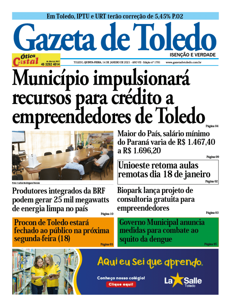 Edição em PDF, 14/01/2021 – Município impulsionará recursos para crédito a empreendedores de Toledo