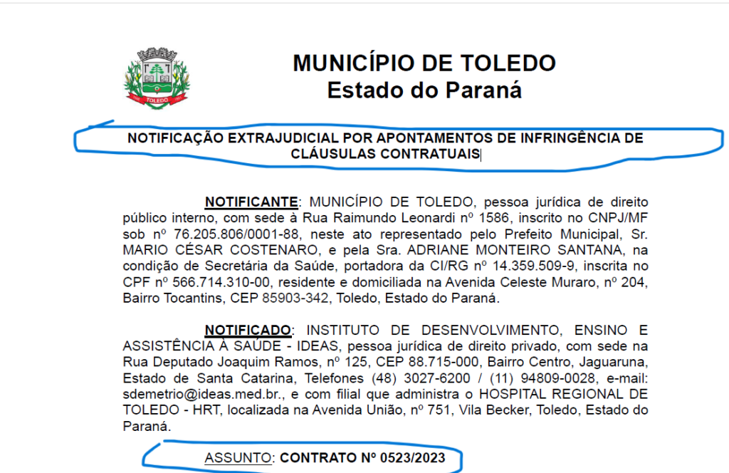 Prefeitura de Toledo notifica IDEAS e dá prazo de 15 dias para resposta e regularização do HRT