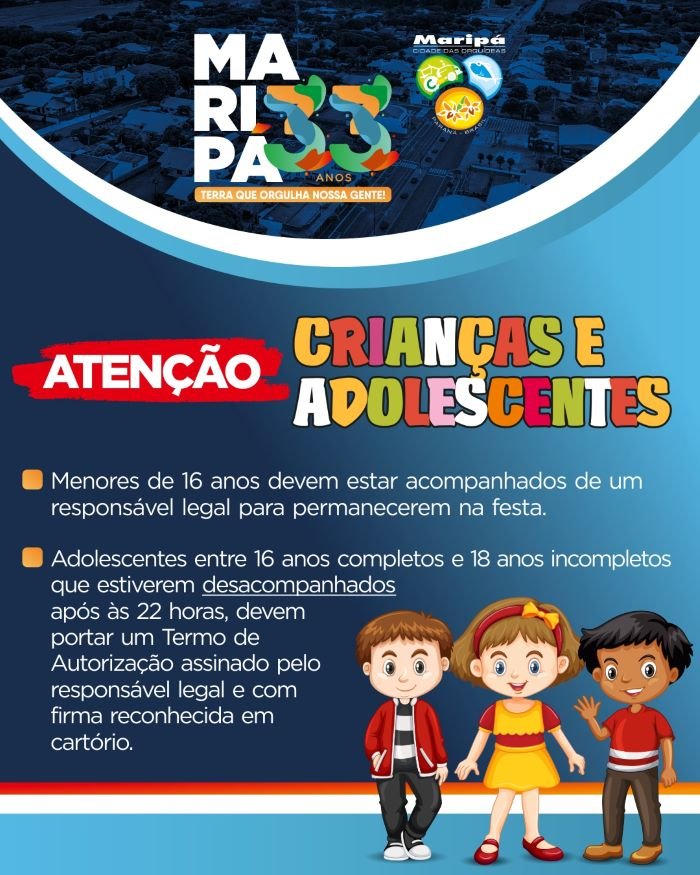 O Município de Maripá terá ampla programação entre os dias 14 e 17 de abril para celebrar seus 33 anos de Emancipação Político-Administrativa. Visando garantir a segurança integral de crianças e adolescentes que irão prestigiar o evento, algumas orientações deverão ser seguidas.