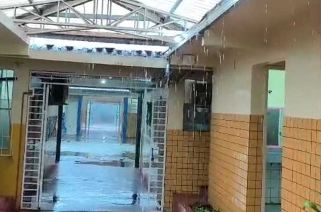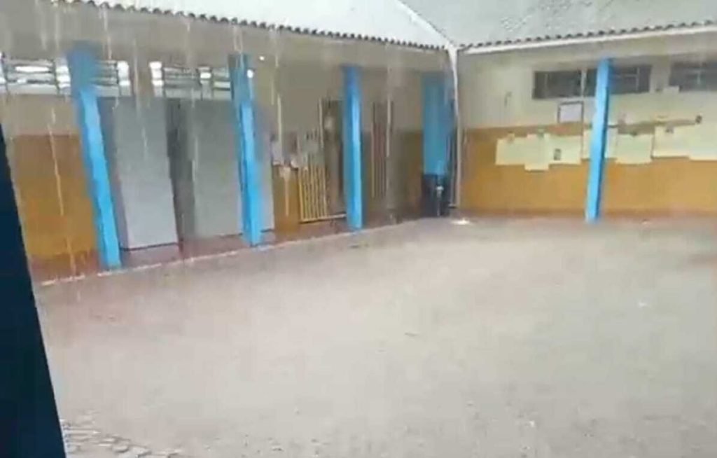 Rachaduras nas paredes, parte elétrica comprometida, goteiras constantes e danos no telhado fazem parte da rotina. Em vários setores, baldes e bacias são usados para conter a água que cai do teto. Professores relatam que, durante as chuvas, precisam acalmar as crianças, que ficam assustadas com a enxurrada entrando pelas portas e corredores. “Eles ficam apreensivos, alguns até choram”, relatam.