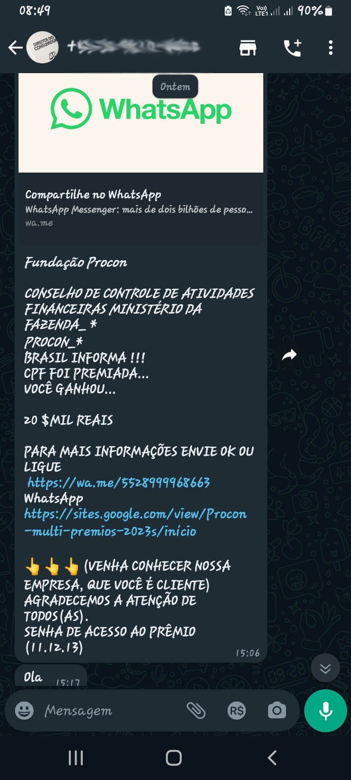 Um dos cidadãos foi lesado após receber mensagens pelo aplicativo WhatsApp afirmando que teria direito a R$ 20 mil da “Fundação Procon”, entidade que não existe. “Para ter acesso a esse valor, o consumidor deveria fazer um Pix de R$ 78,00. Infelizmente ele enviou metade do valor. Claro que era golpe, ou seja, acabou perdendo esse dinheiro”, destaca Claudia Silvano, coordenadora do Procon-PR.