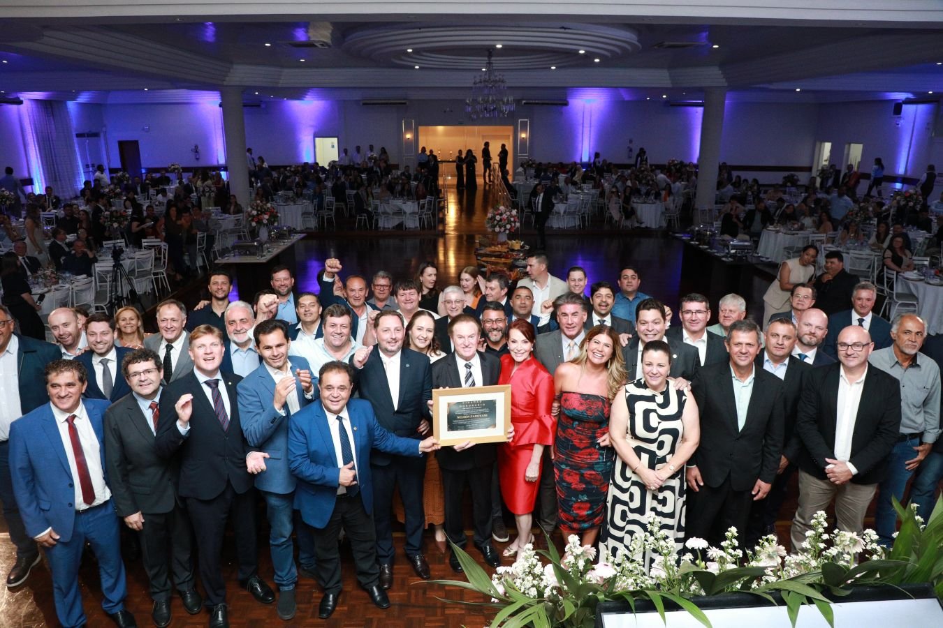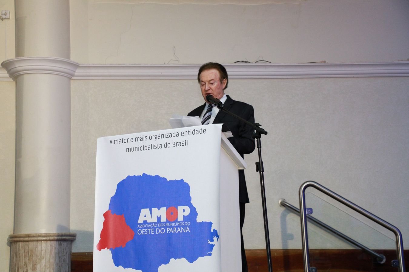A honraria foi entregue durante a realização do evento anual de confraternização da AMOP. O nome do empresário de Cascavel foi escolhido por votação em assembleia realizada pelos prefeitos da entidade.