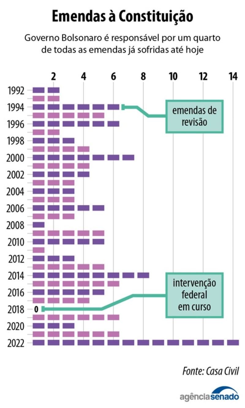 O Congresso Nacional promulgou 14 emendas à Constituição em 2022. O número é recorde para um único ano desde que a Carta entrou em vigor.