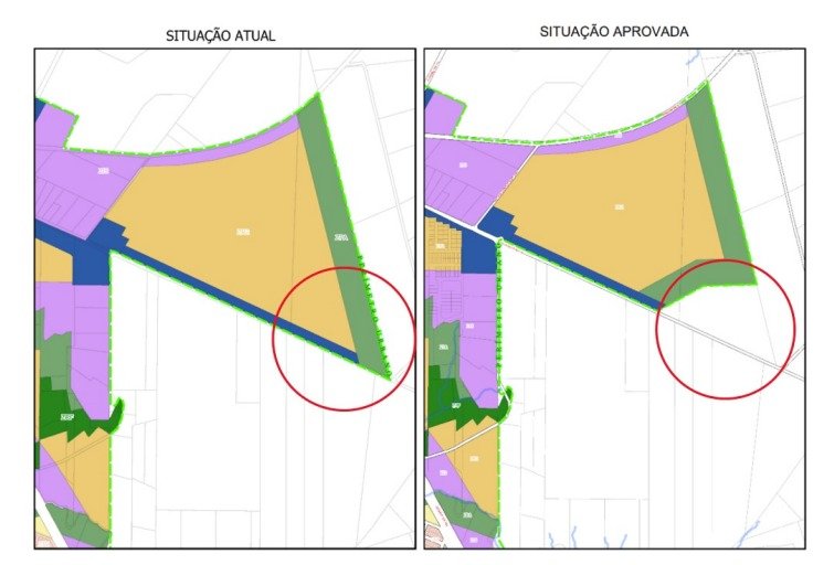 À margem da área residencial criada em 2024 (Lei n° 2.858/2024), a proposta visa implementar uma Zona de Proteção Ambiental no raio de 500m entre a Zona Residencial e a empresa Coamo. Ou seja, na área delimitada (imagem abaixo), não será possível fazer o parcelamento de solo em lotes para edificações. “No ano passado, foi feita essa ampliação do perímetro urbano. Já tinha o processo com a Coamo. O Ministério Público interveio na situação, durante esse ano, pedindo para o Município fazer as adequações, a pedido da própria Coamo, que durante todo o processo da saída da sede, foi direcionada para lá por uma finalidade: para não fazer esse recebimento e gerar esses resíduos. Essa matéria foi levada ao Concidade e, durante os debates realizados pela equipe técnica e pelos demais membros, optou-se em reduzir o perímetro urbano (…) nesse raio de 500m, para garantir a segurança da Coamo para continuar no local e ter o zoneamento adequado”, explicou a engenheira.