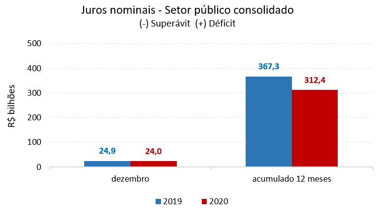 Os juros nominais do setor público consolidado, apropriados por competência, somaram R$24 bilhões em dezembro, comparativamente a R$24,9 bilhões no mesmo mês de 2019. No ano, os juros nominais atingiram R$312,4 bilhões (4,22% do PIB), comparativamente a R$367,3 bilhões (4,96% do PIB) no ano anterior, evolução influenciada pela redução na taxa Selic no período.