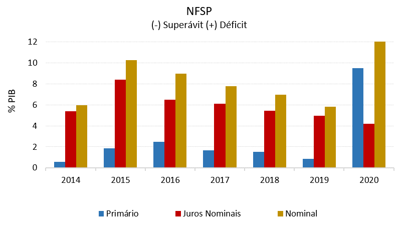 O crescimento do déficit nominal do setor público consolidado em 2020, para 13,70% do PIB, decorreu exclusivamente da elevação do déficit primário, uma vez que os juros nominais, seguindo a trajetória de redução iniciada em 2016, alcançaram o menor valor, como percentual do PIB, da série histórica anual iniciada em 2002, 4,22%.