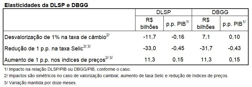 A tabela a seguir atualiza as elasticidades da DLSP e da DBGG a variações na taxa de câmbio, na taxa de juros e nos índices de preços para o mês de dezembro.