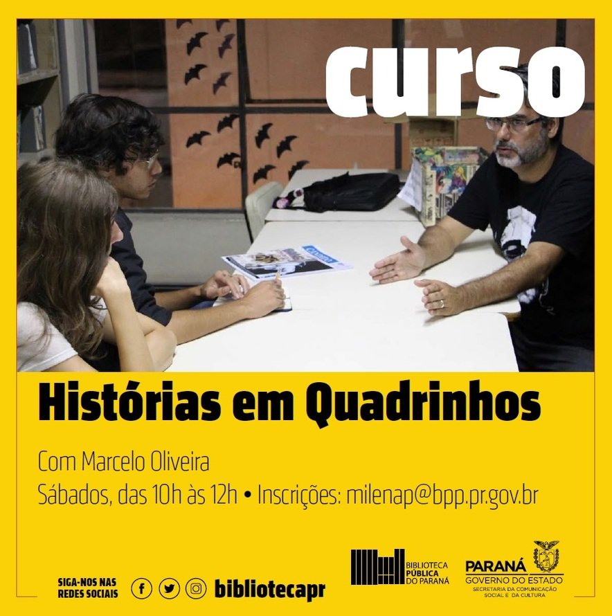 A Biblioteca Pública do Paraná está com inscrições abertas para um curso de histórias em quadrinhos ministrado pelo professor Marcelo Oliveira. As aulas começam no dia 14 e acontecem todos os sábados, das 10 às 12h, até 7 de dezembro. As inscrições são gratuitas pelo e-mail milenap@bpp.pr.gov.br — é necessário informar nome e telefone para contato. A idade mínima para participar é de 10 anos, e os alunos devem possuir material de desenho (folhas sulfite, lápis ou lapiseira, borracha, régua e caneta nanquim 0.3).