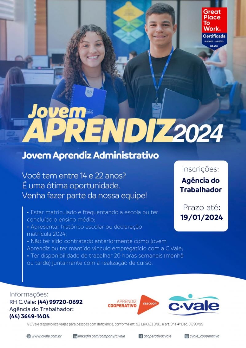 No período de 3 a 19 de janeiro, a C.Vale estará com as inscrições abertas para o processo seletivo dos programas Jovem Aprendiz Administrativo e Jovem Aprendiz Indústria, em Palotina. A cooperativa, em parceria com o Sescoop, vai contratar jovens com idade entre 14 e 22 anos (administrativo) e de 18 a 22 anos (indústria), que estejam cursando ou tenha concluído o ensino médio.