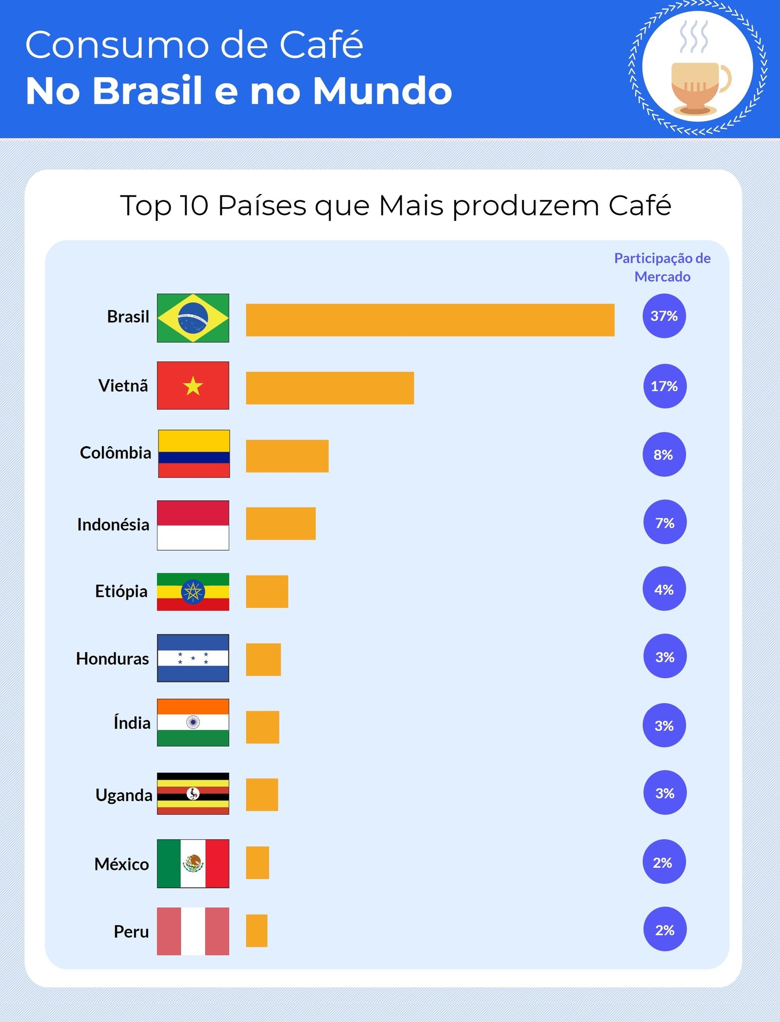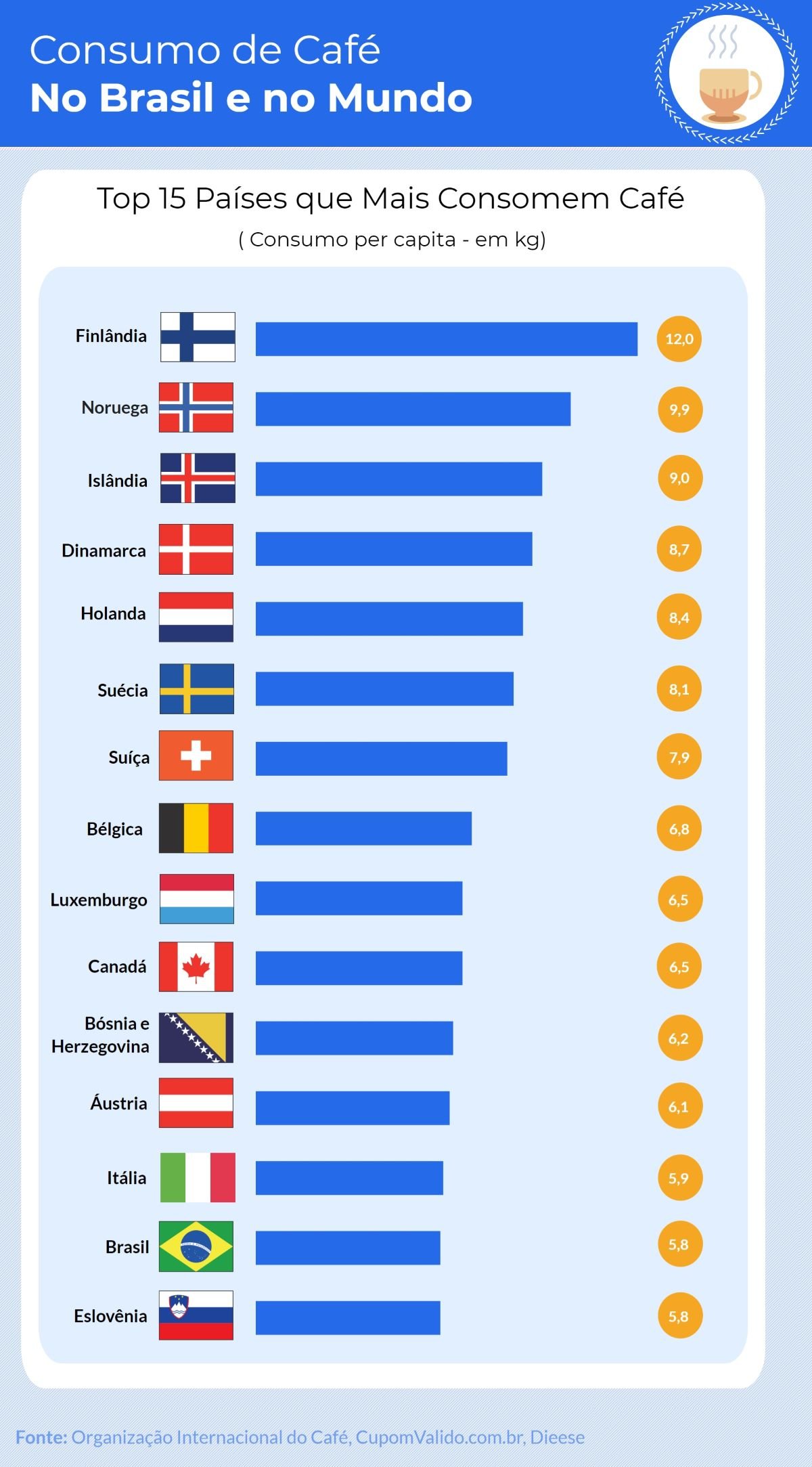 De um total de 193 países, o Brasil está entre os top 15 países que mais consome café no mundo, na atual posição 14ª.