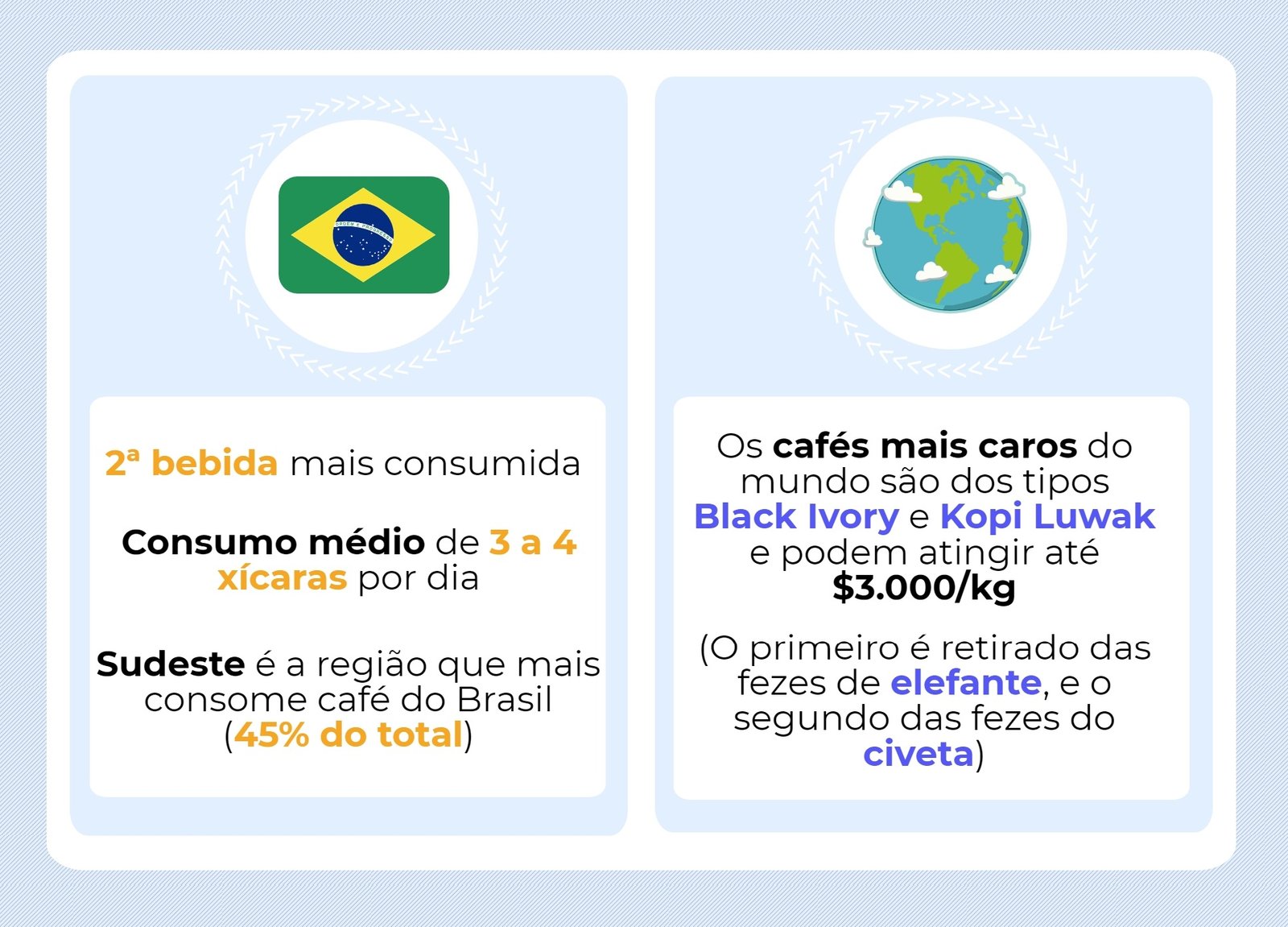 O café é a 2ª bebida mais consumida no Brasil, só ficando atrás da água. Na média, os brasileiros bebem de 3 a 4 xícaras de café por dia, o que equivale a aproximadamente 5,8kg ao ano.