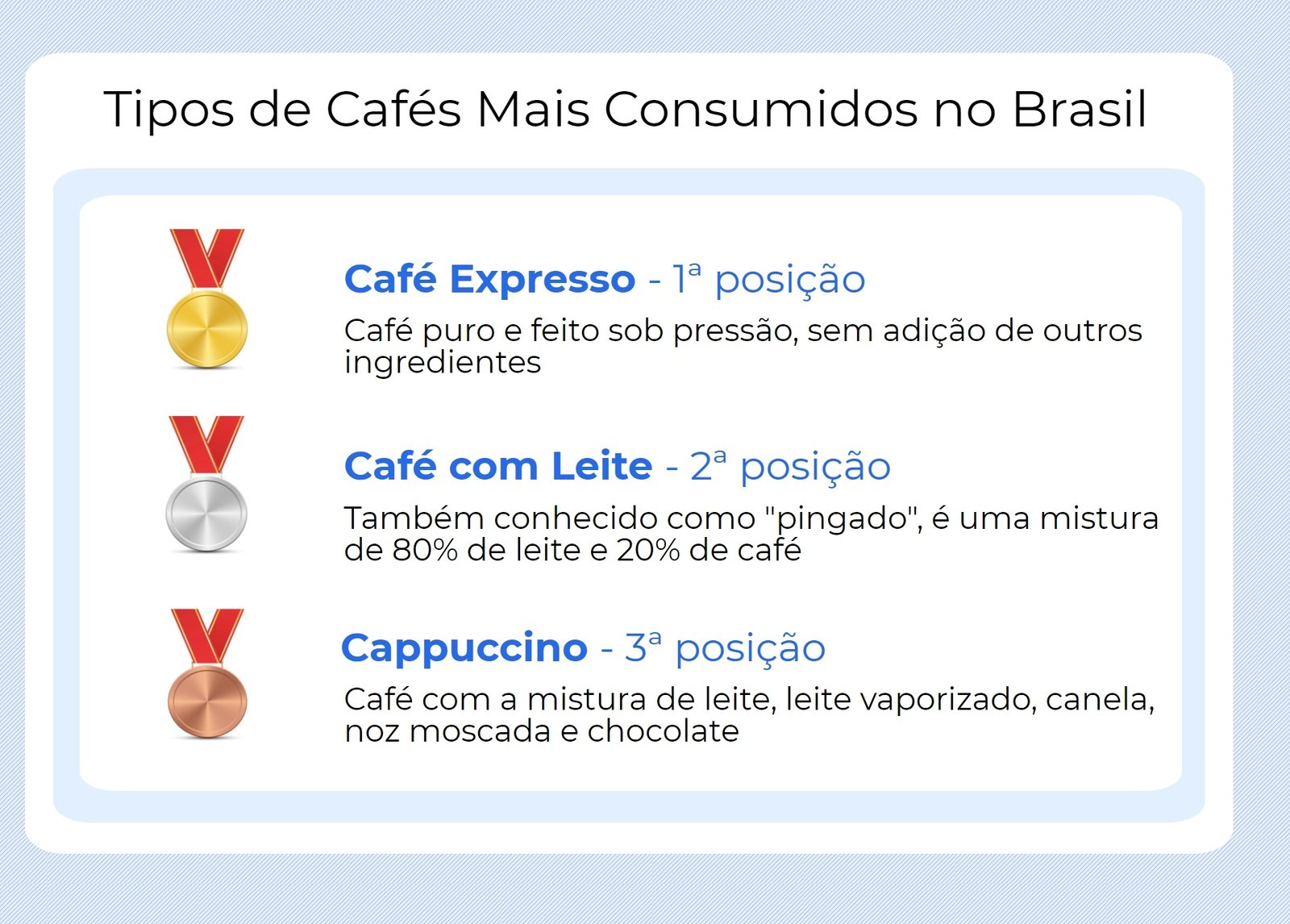 O tipo de café preferido dos brasileiros é o café expresso (opção pura do café e sabor mais forte). Em segundo lugar está o pingado ou café com leite (mistura de 80% de leite com 20% de café).