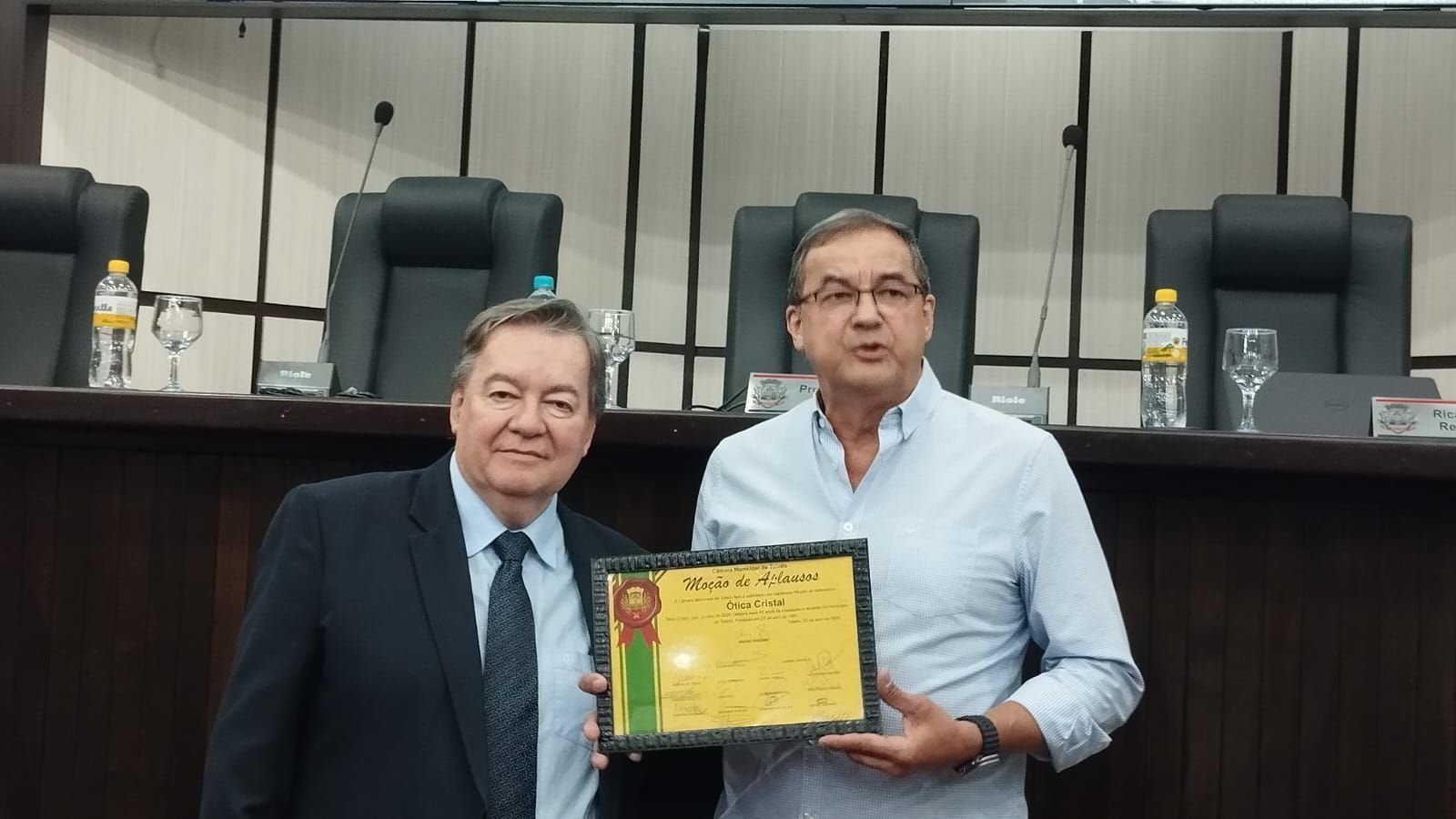 Nesta quinta-feira, 23, antes do início da 10ª Sessão Suplementar, a Câmara de Vereadores de Toledo prestou uma justa e merecida homenagem à Ótica Cristal, que, neste mês de abril, celebra seus 45 anos de instalação e atuação no município de Toledo.