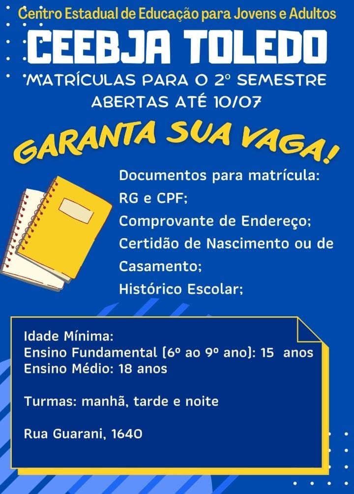 O Centro Estadual de Educação Básica para Jovens e Adultos Toledo (CEEBJA) informa que entre os dias 27 de junho a 10 de julho estará com as matrículas abertas para o segundo semestre de 2022, com o início das aulas em julho desse ano.