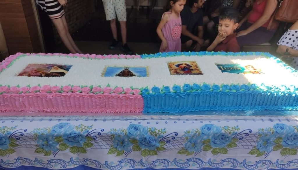 “A gente tinha um outro forno lá no sítio. Daí, como o nosso quebrou — caiu e quebrou o vidro da porta —, tiramos a porta daquele e colocamos no que estava com defeito. Sem o vidro, não dava para fazer os bolos. Mas conseguimos resolver, sim. Está tudo tranquilo agora. Já foram feitas sete massas de bolo, e hoje à noite (esta sexta-feira, 10), ou amanhã (este sábado, 11), vamos termina de fazer o que falta. Está tudo certo: já temos balas, pirulitos, refrigerantes… Estava faltando um pouco de refrigerante, mas um rapaz ajudou a gente. Nunca pedimos dinheiro, porque achamos feio, sabe. Mas ele, o Adenilson Venturini — que é conhecido nosso — mandou um valor para gente comprar o refrigerante. Foi de coração. Até domingo ainda devem chegar mais doações. Sempre tem gente que ajuda no próprio dia. Então, a gente vai conseguir fazer a festa, sim. A Marisa, da Casa da Amizade, também está ajudando este ano. Está todo mundo colaborando, então vai dar tudo certo, se Deus quiser. Só espero que não chova. Porque se chover, a gente vai ter que colocar todo mundo dentro de casa, e não vai caber. Mas pelo menos um pouco cabe. Vamos ver. A gente nunca sabe o dia de amanhã, mas, se Deus quiser, vai dar tudo certo, sim”, aguarda dona Maria.