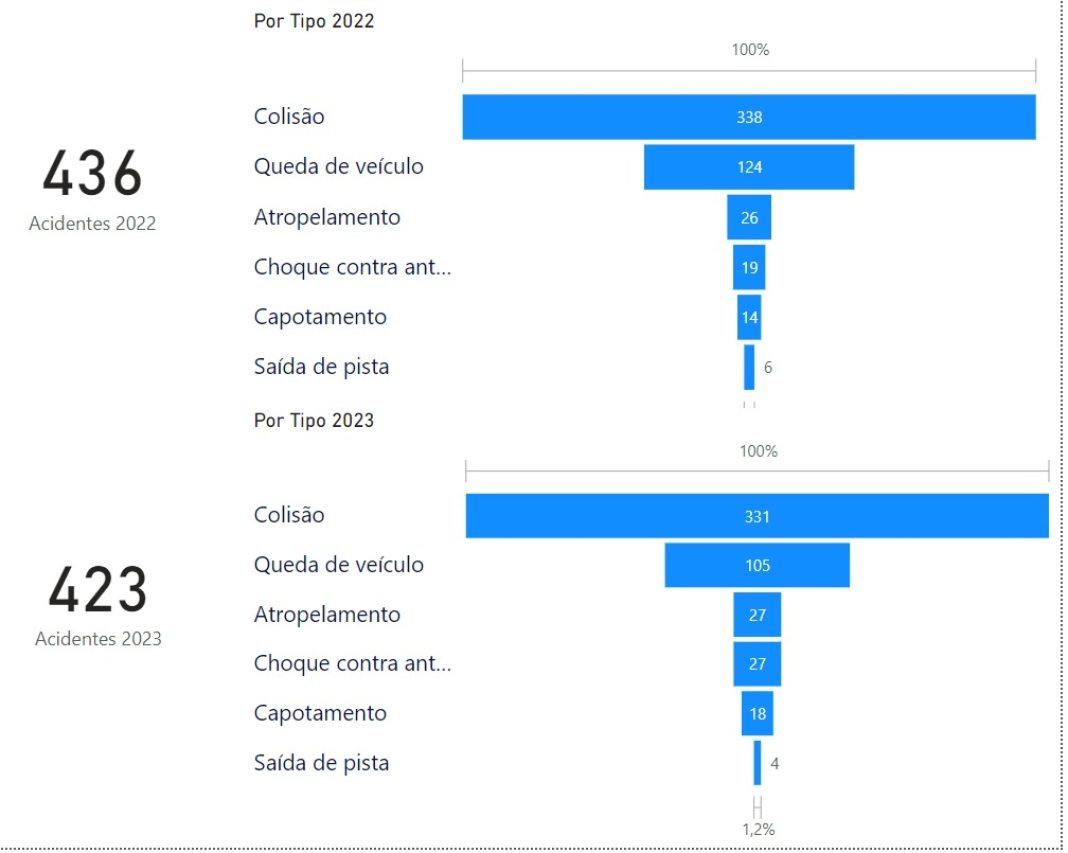 Uma redução de aproximadamente 3%. Nos quatro primeiros meses de 2023, cinco pessoas perderam a vida por acidente de trânsito, em 2022 foram quatro vítimas fatais.Dos 423 acidentes nos quatro primeiros meses do ano, 331 foram por colisão (312 vítimas), 105 por queda de veículo (103 vítimas), 27 atropelamentos. Em 2022, os números foram: 338 por colisão (339 vítimas), 124 por queda de veículos (124 vítimas) e 26 atropelamentos.