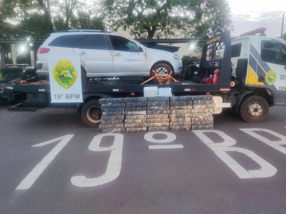 De acordo com a PM, um veículo Fiat Palio Weekend, de cor prata e placas de Curitiba, desobedeceu a ordem de parada e entrou em uma estrada rural. O condutor abandonou o carro e fugiu em meio a uma área de mata, não sendo localizado até o momento.