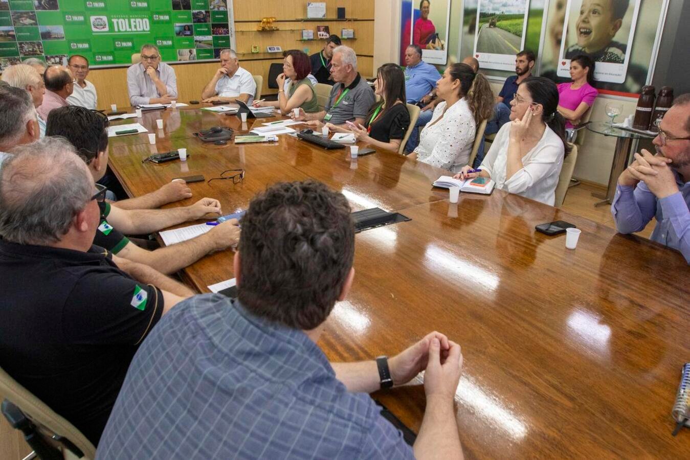 Nessa segunda-feira (29) a sala de reuniões do Gabinete do Prefeito recebeu o Conselho Municipal de Desenvolvimento do Agronegócio de Toledo (CMDAT) e produtores pecuaristas da região Oeste do Paraná. O objetivo foi debater sobre a incidência do Imposto Sobre Circulação de Mercadorias e Serviços (ICMS) sobre venda de peixe vivo para fora do estado do Paraná. A reunião contou com a presença do deputado federal Dilceu Sperafico, do prefeito Mario Costenaro e do vice-prefeito Lucio De Marchi.