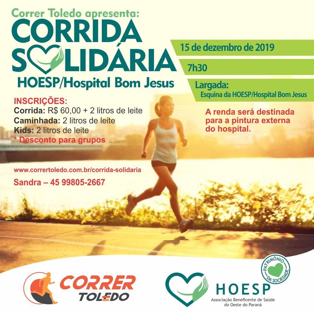 As inscrições para a Corrida Solidária da HOESP/Hospital Bom Jesus já estão abertas e podem ser feitas pelo site www.corrertoledo.com.br/corrida-solidaria, onde é possível também consultar o regulamento e outras informações sobre o evento.
