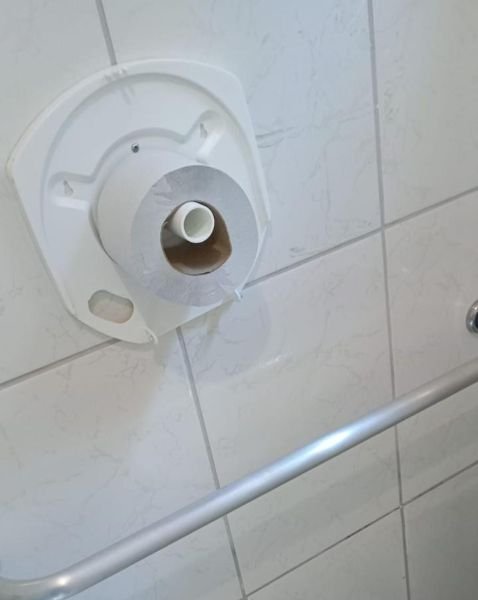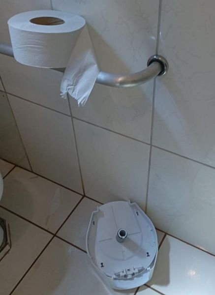 O problema, agora, vem de baixo. Alguns “colaboradores(as)” resolveram trocar o crachá pelo vandalismo. Banheiros depredados, válvulas quebradas, caixas d’água danificadas, rolos de papel jogados no vaso e, no último ato, até saco de lixo do banheiro foi parar dentro do vaso com descarga acionada.