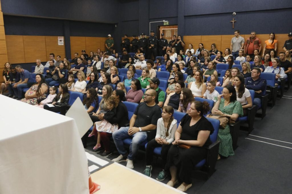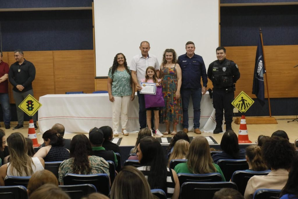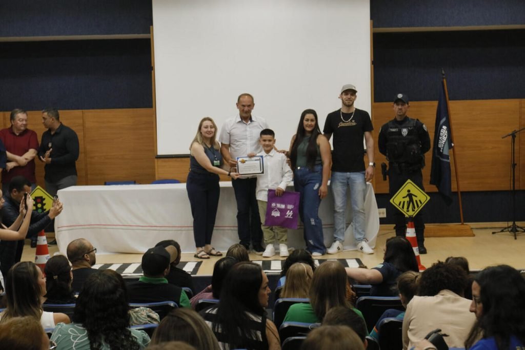 O Auditório Acary Oliveira, anexo ao Paço Municipal Alcides Donin, foi palco, nesta quinta-feira (18), de uma manhã especial para 36 estudantes do 4º ano do Ensino Fundamental da rede municipal de Toledo (confira a lista com os nomes no fim da matéria). Elas foram reconhecidas por terem desenhos de sua autoria selecionados pelo EducaTrânsito para ilustrar o calendário 2026 do programa, que é fruto de parceria entre a Secretaria Municipal da Educação (Smed) e a Secretaria Municipal de Segurança e Trânsito (SMST).