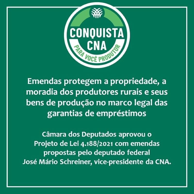 As emendas apresentadas pelo deputado federal José Mário Schreiner, vice-presidente da Confederação da Agricultura e Pecuária do Brasil (CNA), protegem a propriedade, a moradia dos produtores rurais e seus bens de produção no Projeto de Lei 4.188/2021 que cria o marco legal das garantias de empréstimos.