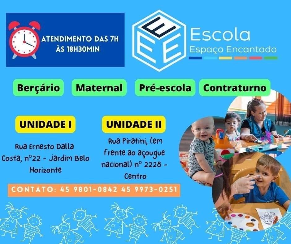 A escola Espaço Encantado mantem as portas abertas das 7 horas da manhã às 18 horas e 30 minutos – para proporcionar um atendimento eficaz à população Toledana.