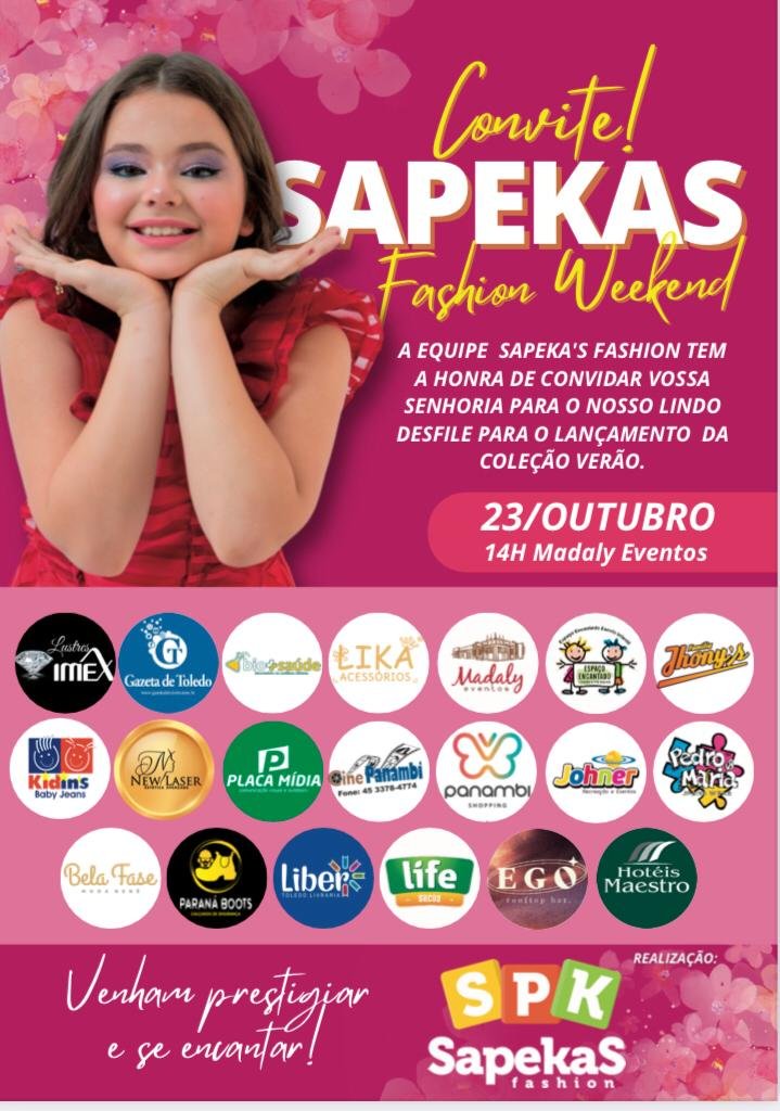 No domingo à tarde acontece o grande desfile da Sapekas Fashion, no Madaly Eventos, a partir das 14hs, com o lançamento da coleção verão. Este ano o diretor da Kids Agency, Leandro Pontes estará de forma on line presente no evento. E mais uma vez os artistas Rafael Chapouto e Beta Brito estarão participando do desfile.