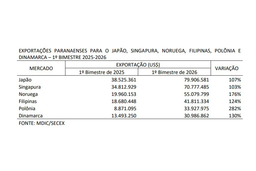 Exportações do Paraná para Dinamarca, Singapura, Noruega, Polônia e Japão dobram em 2026