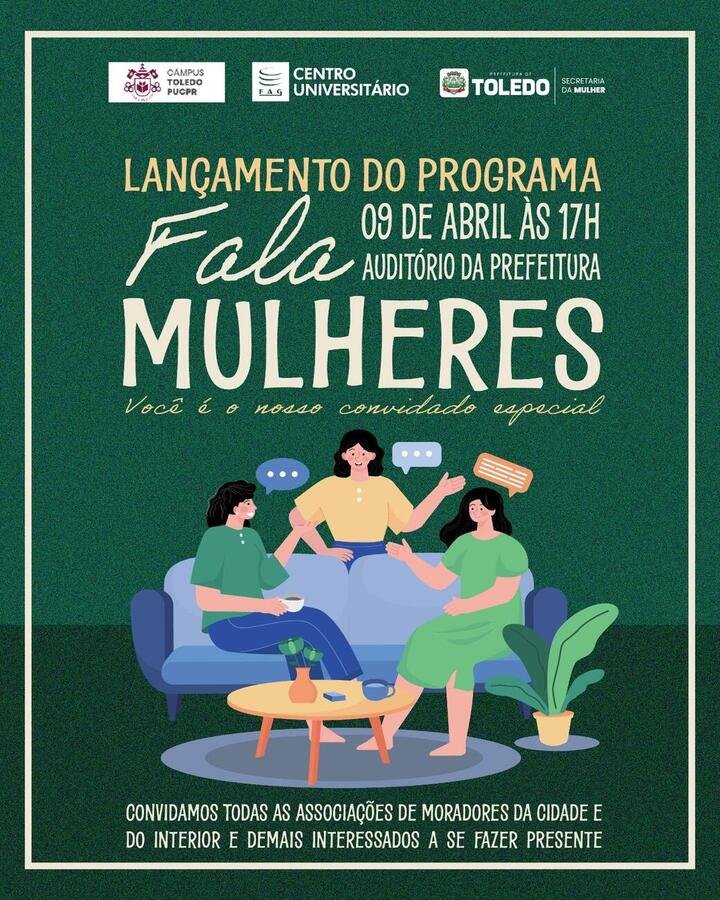 Nesta quinta-feira (9) às 17h será lançado, no Auditório Acary Oliveira, o programa “Fala Mulher”, uma iniciativa da Prefeitura de Toledo, por meio da Secretaria da Mulher, em parceria com o curso de direito da Pontifícia Universidade Católica do Paraná (Puc/PR) e da Faculdade Assis Gurgacz (Fag) e apoio da União Toledana das Associações de Moradores (Utam).