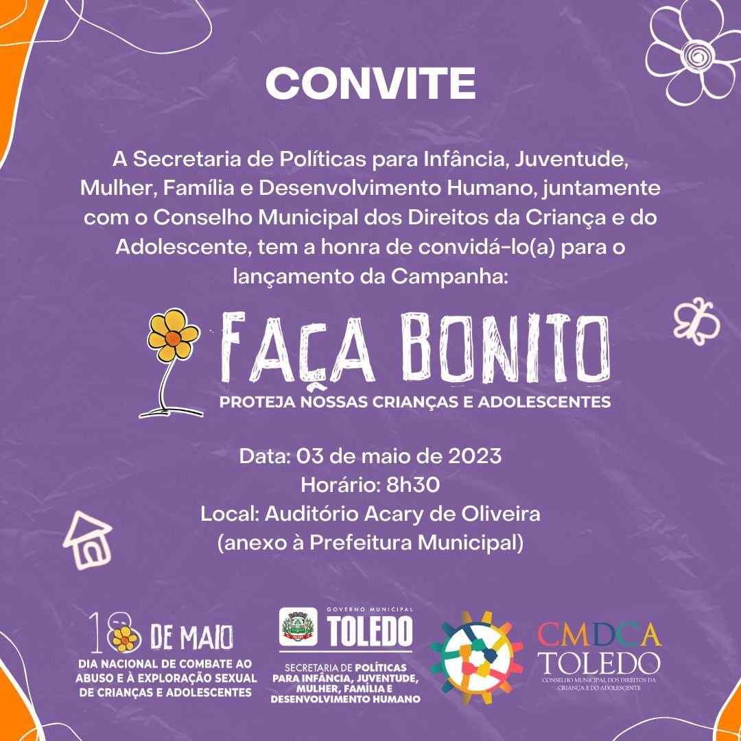 Esse é o nome da campanha que irá incentivar a proteção das crianças e adolescentes de Toledo. Essa campanha está sob a responsabilidade da secretaria de Políticas para Infância, Juventude, Mulher, Família e Desenvolvimento Humano (SMDH) e o Conselho Municipal dos Direitos da Criança e do Adolescente (CMDCA).