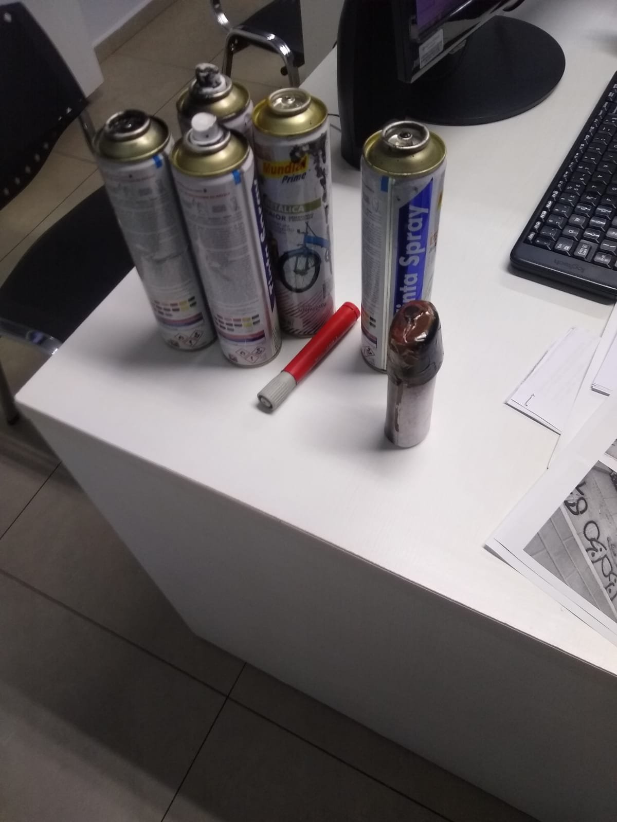 Durante a abordagem, os guardas revistaram os delinquentes e encontraram em suas mochilas latas de spray das cores preta, dourada e vermelha, um canetão de cor vermelha, e também, uma pasta utilizada para engraxar sapatos, da cor preta.