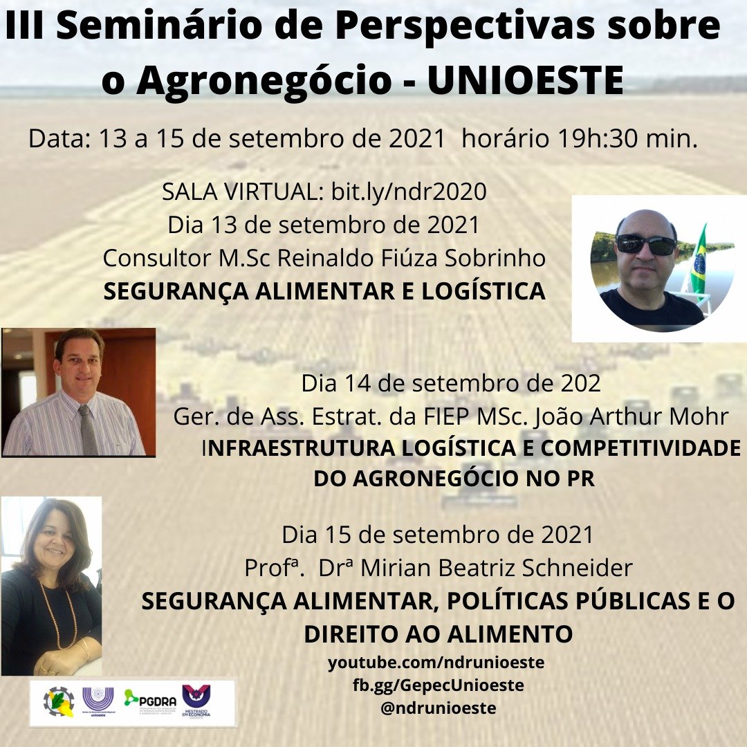 O Núcleo de Desenvolvimento Regional (NDR), da Universidade Estadual do Oeste do Paraná (Unioeste) campus de Toledo, em parceria com o Programa de Pós-Graduação em Desenvolvimento Regional e Agronegócio (PGDRA), o curso de Ciências Econômicas e o Programa de Pós-Graduação em Economia (PGE), realizam o III Seminário de Perspectivas Sobre o Agronegócio, de 13 a 15 de setembro, sempre às 19:30 horas.