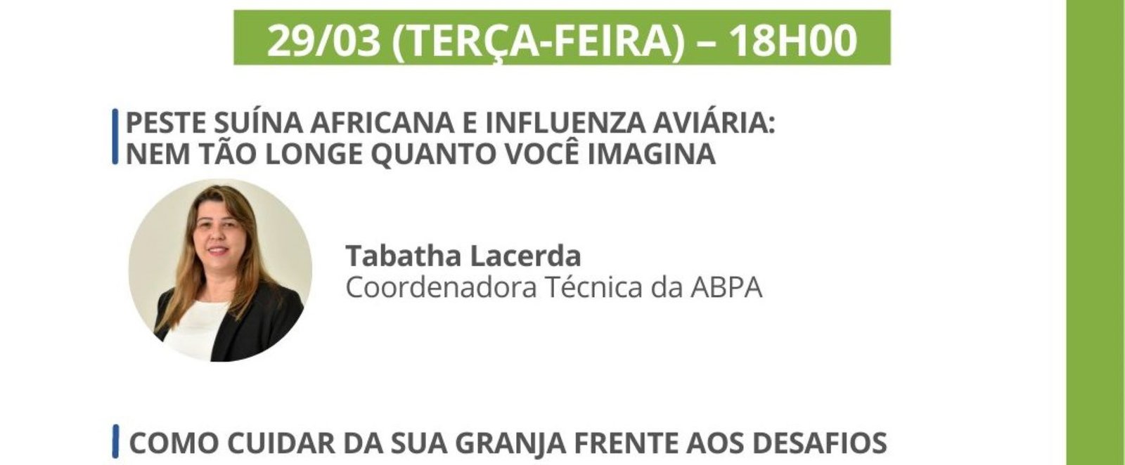Uma das ações acontece juntamente com o “Família Integrada” – iniciativa conjunta da ABPA e seus associados para a realização de cursos para famílias de produtores de todo o Brasil. Na próxima terça-feira (29), às 18h00, acontecerá uma aula on line focada em dicas práticas para preservar a biosseguridade das propriedades rurais, tanto para aves quanto para suínos. A aula será ministrada pela consultora Nelva Grando e pela coordenadora técnica da ABPA, Tabatha Lacerda.