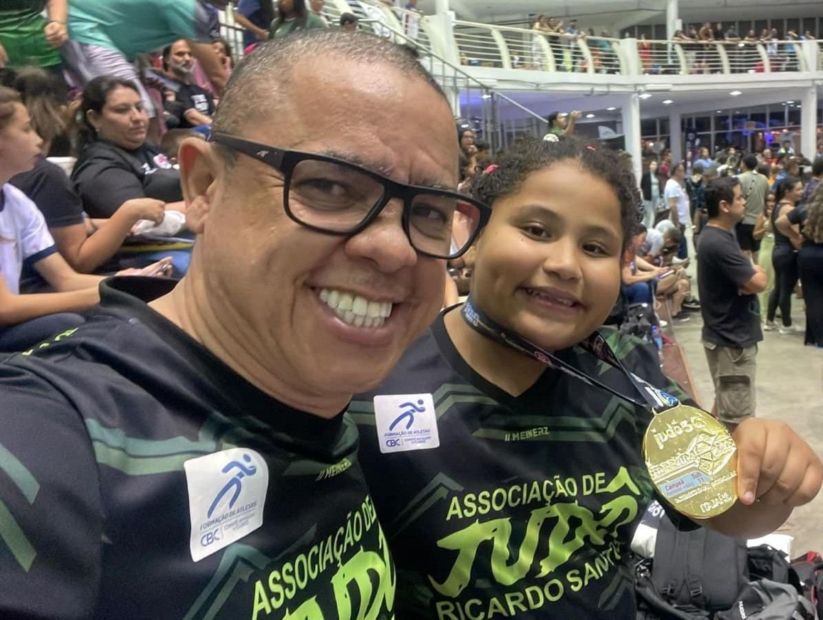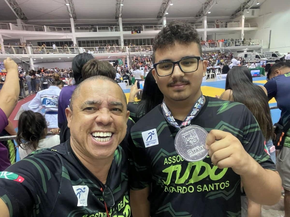 Ricardo ao lado de um dos seus judocas exibindo a medalha. Foto: arquivo pessoal