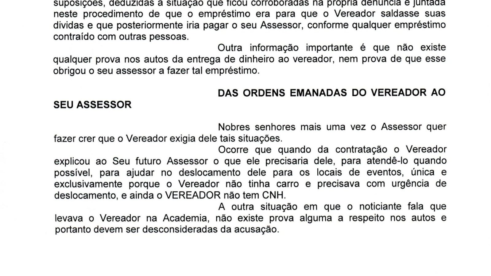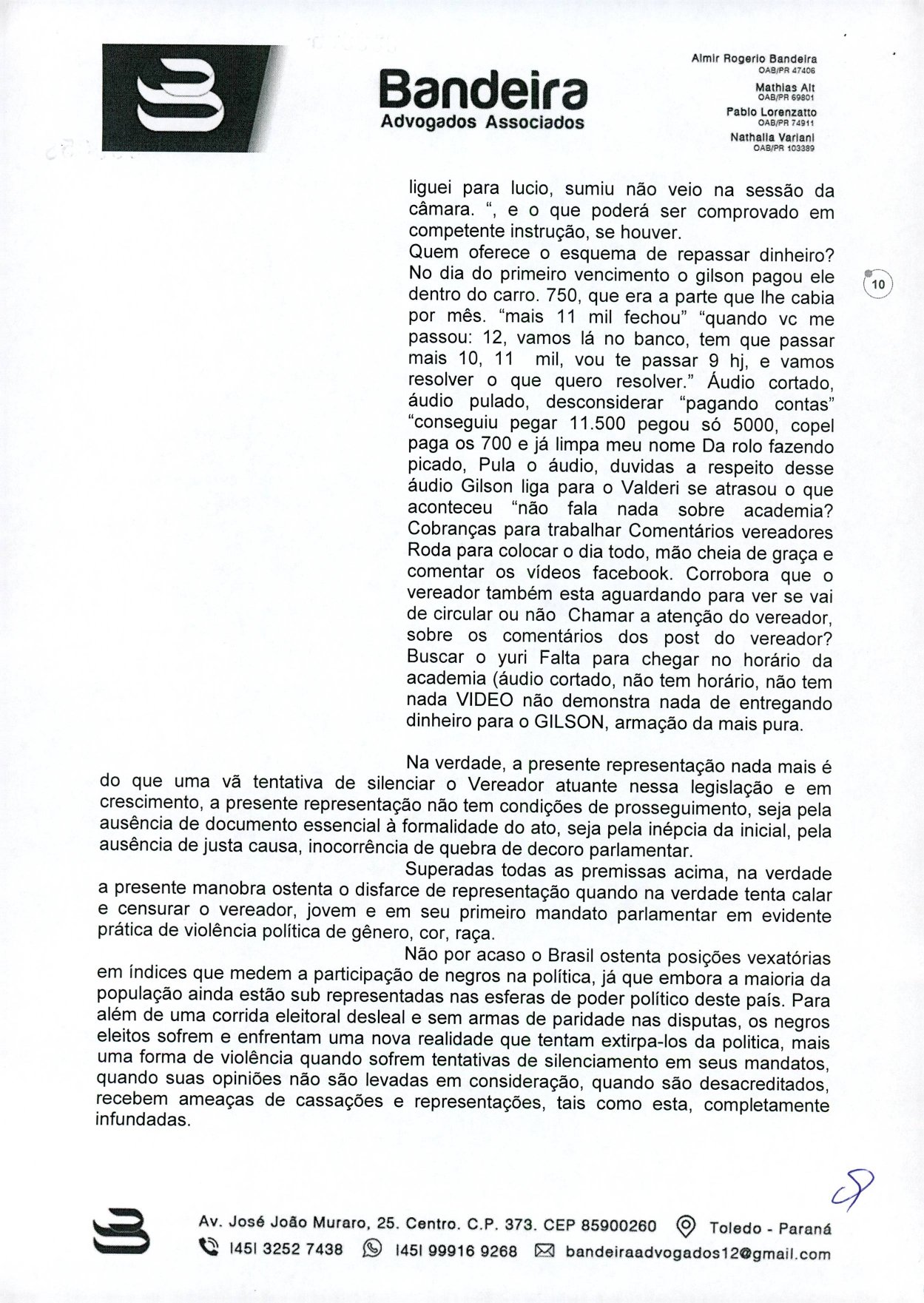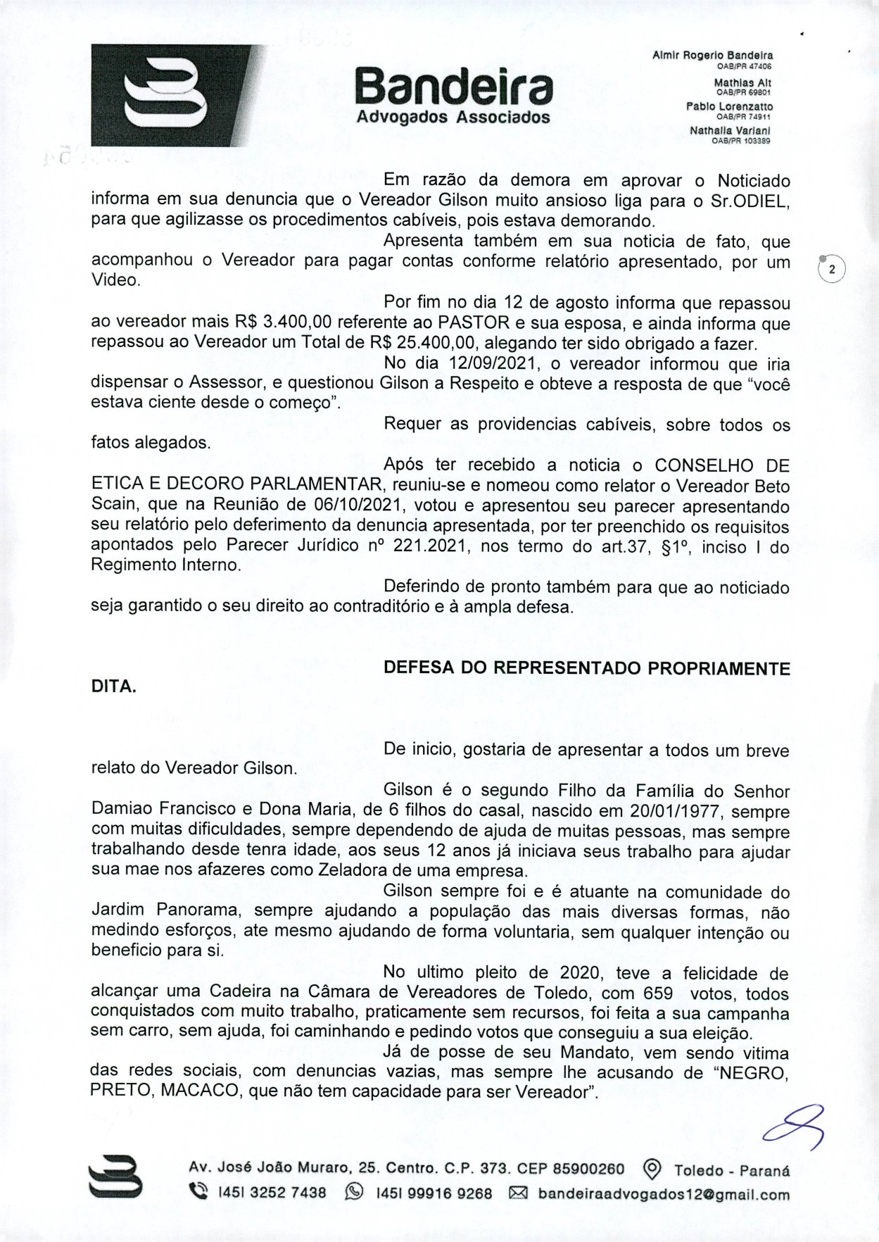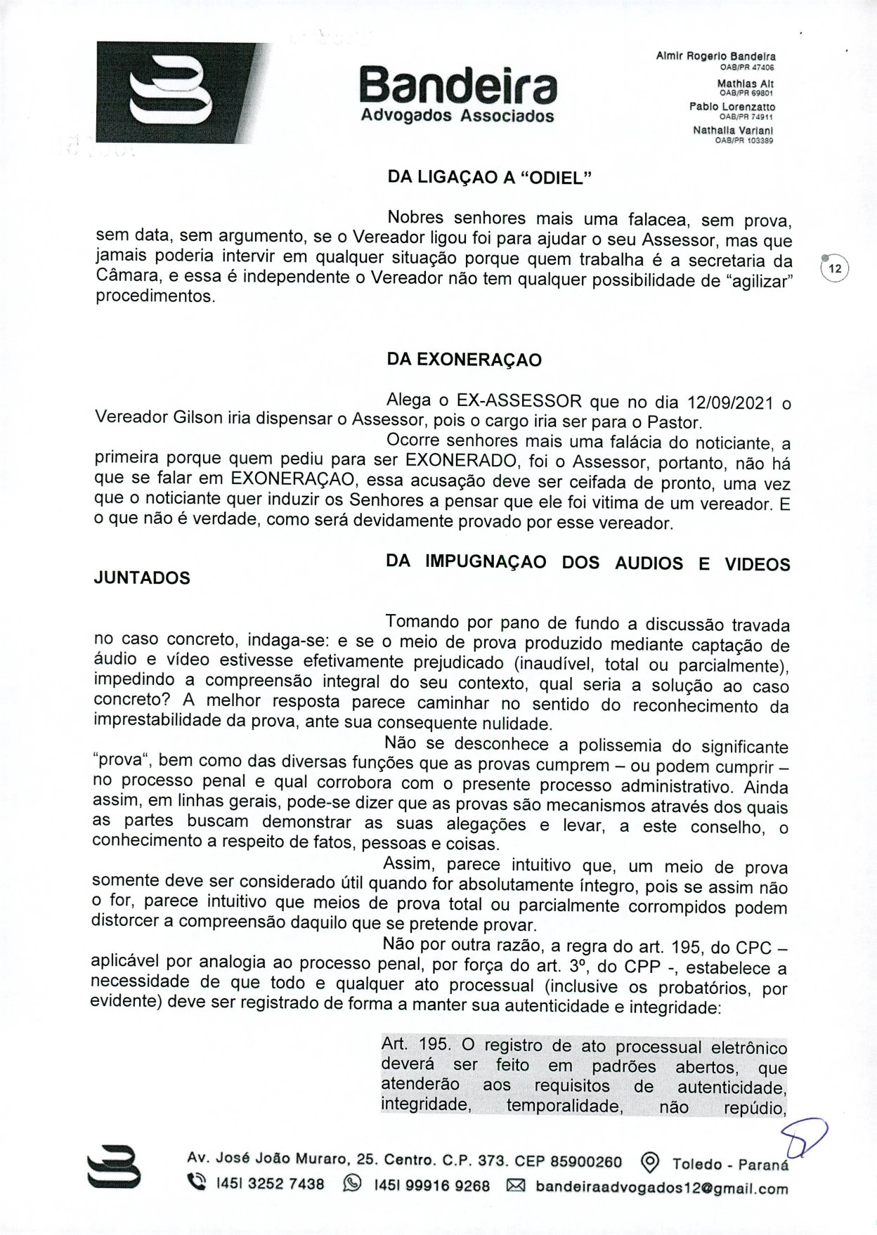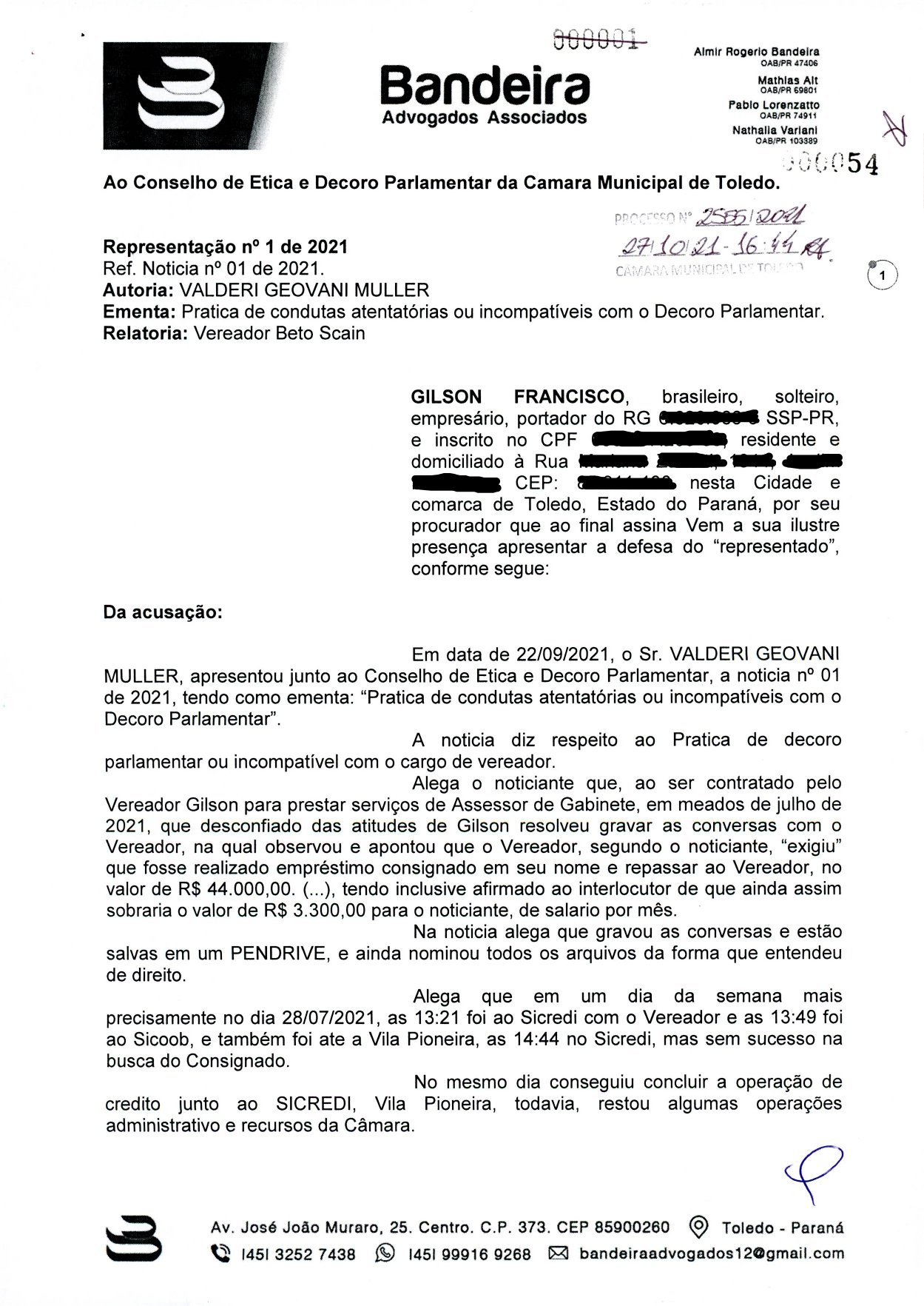 Da mesma forma que publiquei nesse espaço as acusações feitas pelo ex-assessor Valderi Muller em desfavor do vereador Gilson Francisco, hoje tive acesso à defesa por ele protocolada na data de ontem, mais precisamente às 16h44m, e irei reproduzi-la em sua íntegra. Cabe a vocês, nobre leitores da Gazeta, fazerem suas análises, e ao Conselho de Ética e de Decoro Parlamentar ser o mais correto possível nessa decisão.