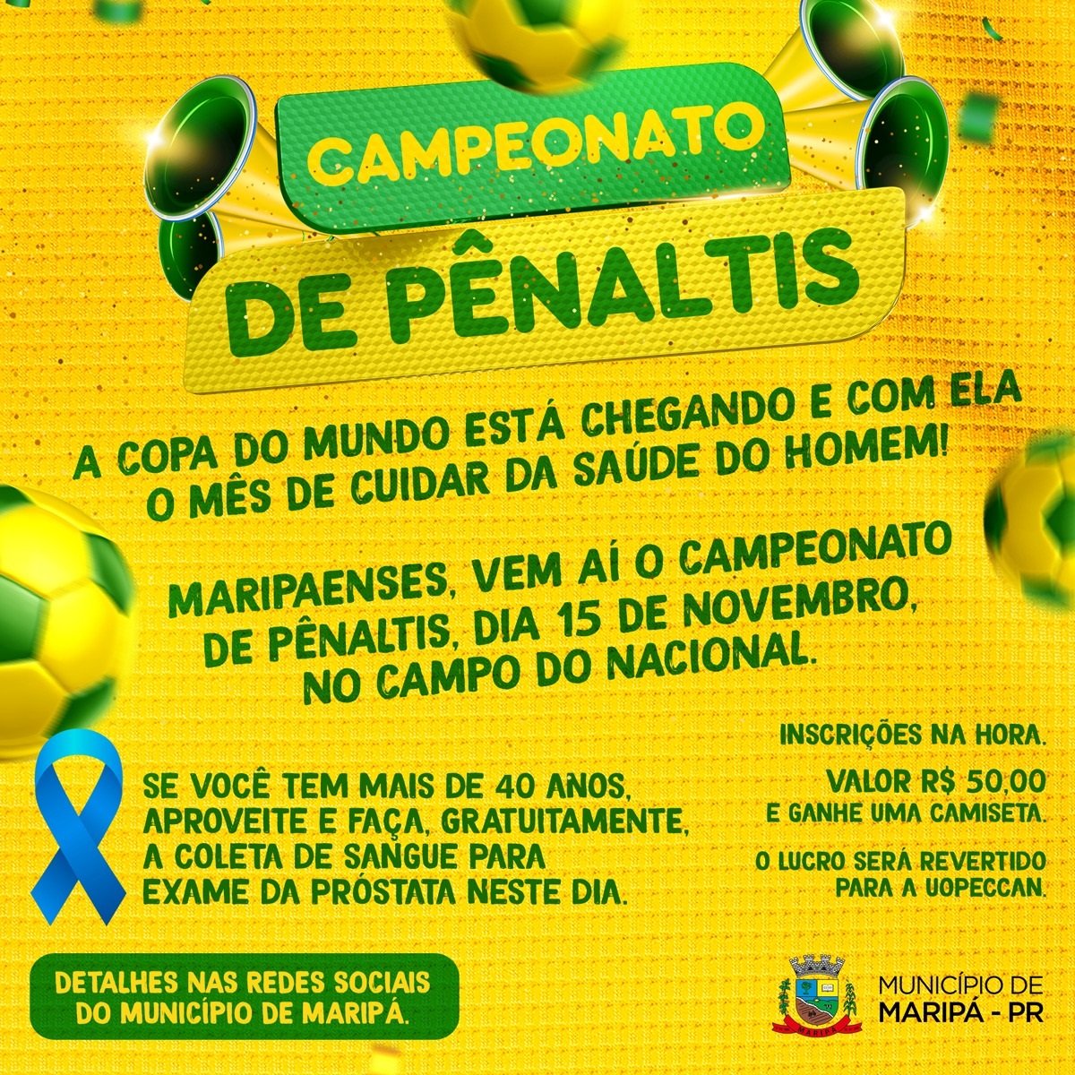 O governo municipal de Maripá promove na próxima terça-feira (15), um Campeonato de Pênaltis. O evento terá início às 9h e ocorrerá no Campo do Nacional e as inscrições serão realizadas na hora. O valor de inscrição é de R$ 50,00 e os participantes recebem uma camiseta alusiva à campanha Novembro Azul, onde o lucro será revertido à Uopeccan, uma parceria com o Núcleo da Mulher Empresária da ACIPA de Palotina.