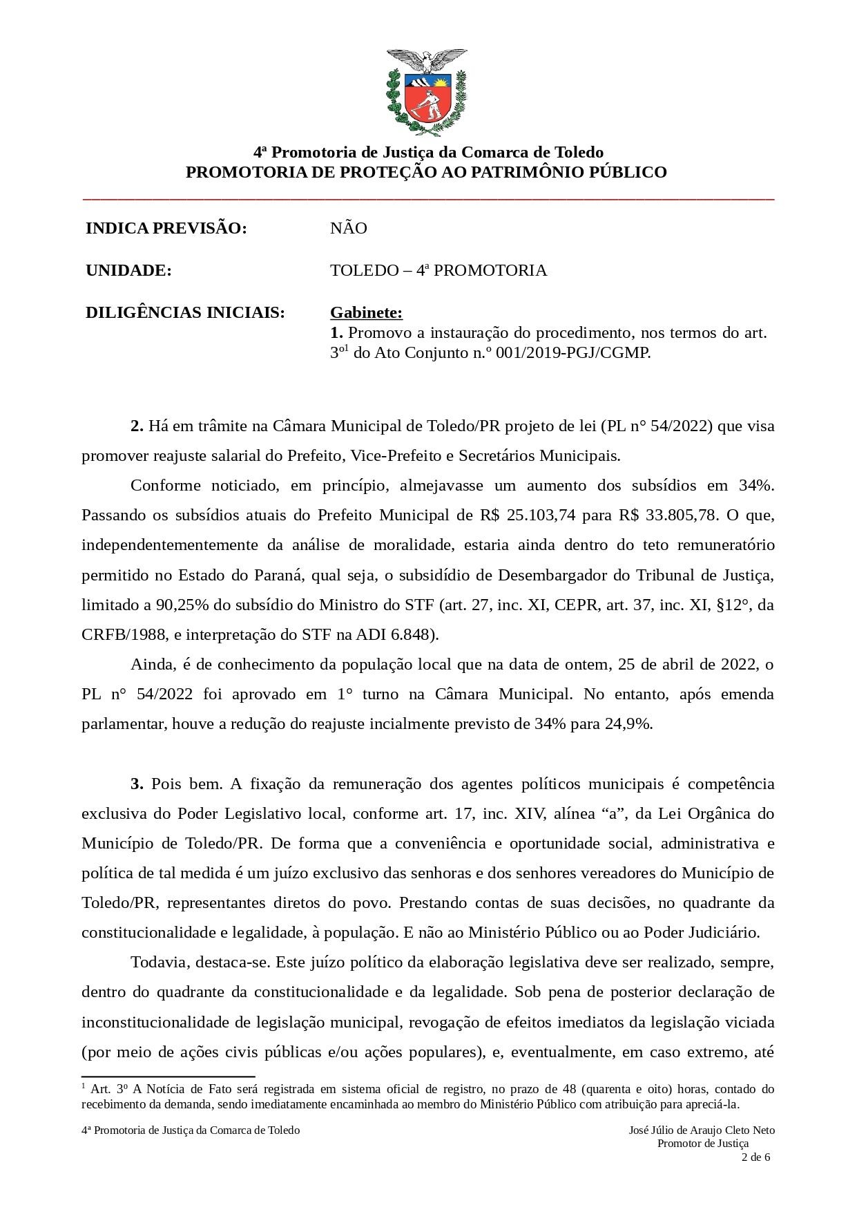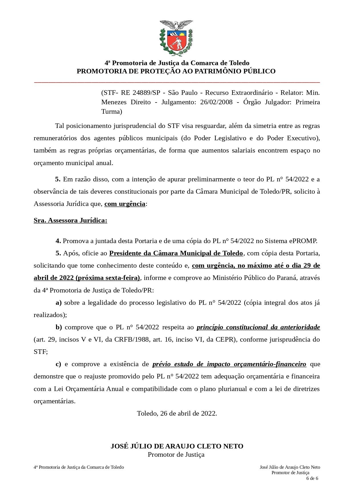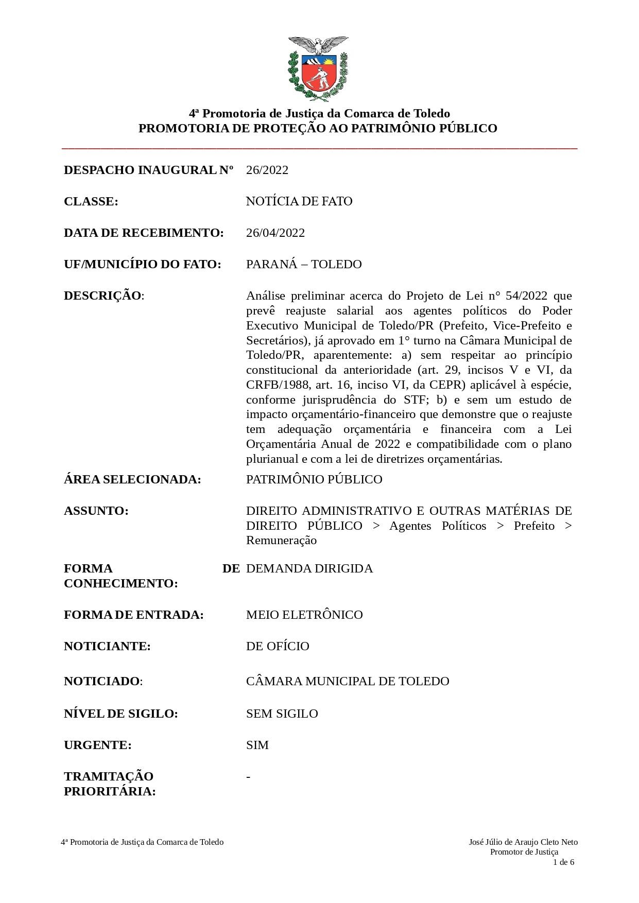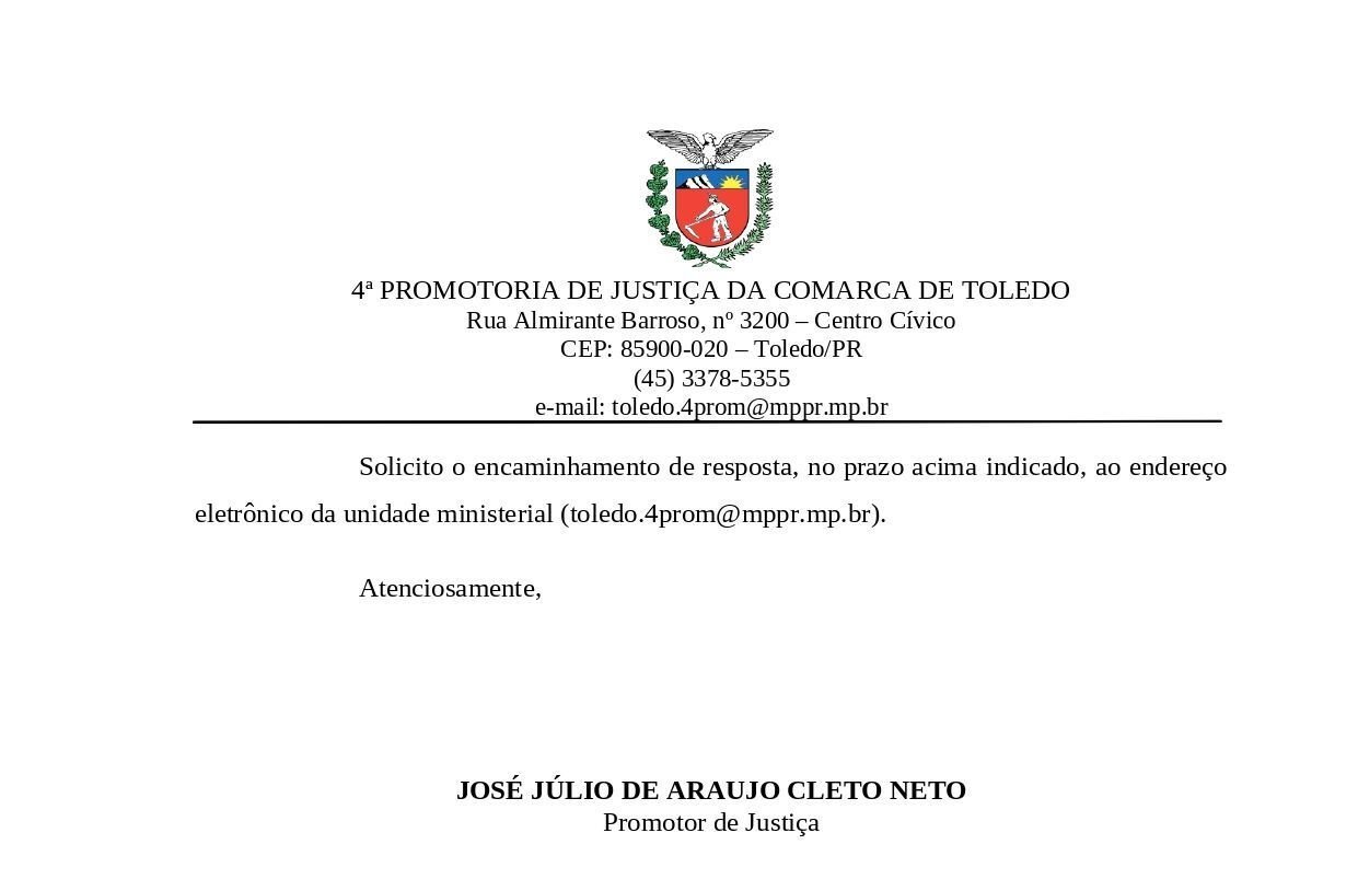 Dr. JOSÉ JÚLIO DE ARAUJO CLETO NETO, promotor de Justiça da 4º Promotoria da Comarca de Toledo, oficializa presidência da Câmara e também abre Notícia de Fato, pedindo maiores esclarecimentos sobe o Projeto de Lei nº 54.