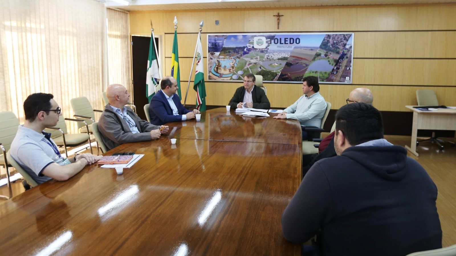Os investimentos para melhorar a mobilidade urbana em Toledo são constantes. Com o intuito de facilitar os deslocamentos dos munícipes que optam pelo uso da bicicleta, na quinta-feira (14), foi firmado o contrato para a reforma da ciclovia e do passeio público e implantação da iluminação da Avenida Parigot de Souza, entre as Ruas Santos Dumont e São João. O ato aconteceu na sala de reuniões do Gabinete do Prefeito e contou com a presença de representantes da construtora e de diversos setores do Executivo Municipal.