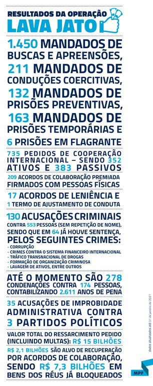Até o fim de janeiro, em quase sete anos de dedicação ao combate à corrupção, a operação acumula números significativos que revelaram para a sociedade os crimes de corrupção que assolam historicamente o Brasil. Foram 79 fases, 1.450 mandados de busca e apreensão, 211 conduções coercitivas, 132 mandados de prisão preventiva e 163 de temporária. Durante as fases, foram colhidos materiais e provas que embasaram 130 denúncias contra 533 acusados, gerando 278 condenações (sendo 174 nomes únicos) chegando a um total de 2.611 anos de pena. Foram também propostas 38 ações civis públicas, incluindo ações de improbidade administrativa contra três partidos políticos (PSB, MDB e PP) e um termo de ajuste de conduta firmado.