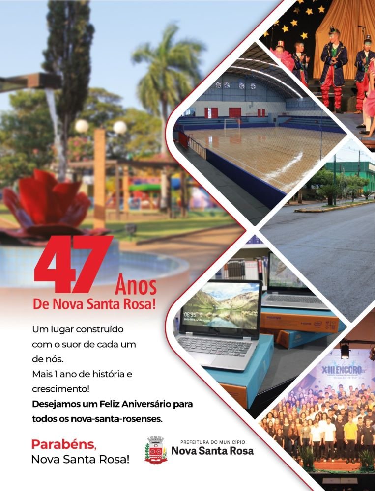 A Prefeitura de Nova Santa Rosa informa que as fichas do Almoço Festivo da comemoração do Aniversário de 47 Anos de Nova Santa Rosa já estão sendo comercializadas. O Almoço Festivo acontece no sábado, dia 29 de abril, no Centro de Eventos do Parque de Exposições Joia do Oeste.