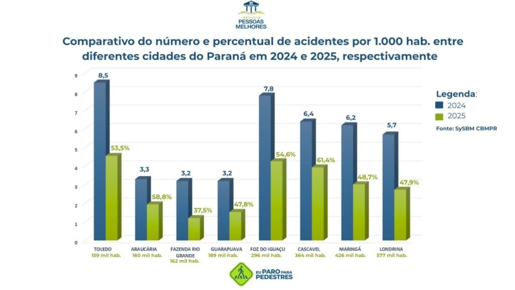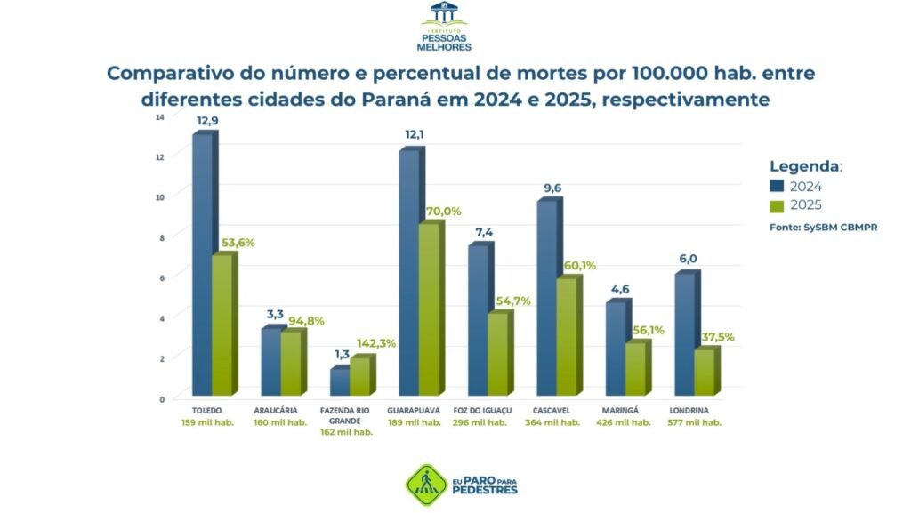 Os dados de mortalidade no trânsito reforçam ainda mais a gravidade da situação. Em 2024, Toledo já apresentava uma taxa elevada de 12,9%, muito acima de cidades do mesmo porte, como Araucária (3,3%) e Fazenda Rio Grande (1,3%), e superior a municípios maiores como Maringá (4,6%) e Londrina (6,0%).