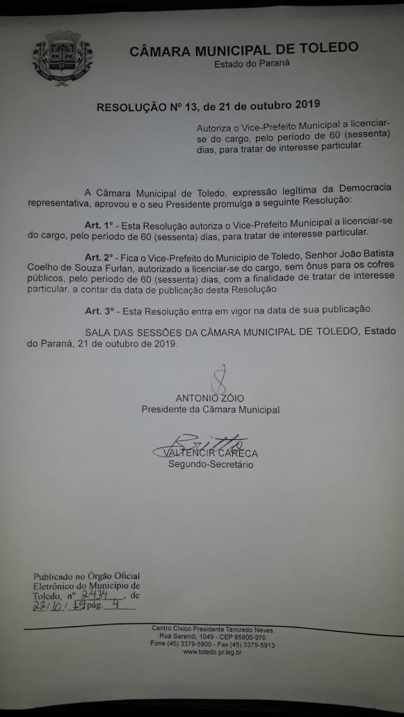 Bom, eu acredito que todos acreditam que você não entende nada de “direitos” mesmo que “formado em direito”, por protocolado um pedido de afastamento do cargo de vice, por 60 dias (resolução nº 13) datados do dia 21 de outubro, portanto o SENHOR não está vice. Mais, em ter protocolado na Câmara de Toledo a sua “não remuneração” sabendo que é inconstitucional? Será que esses seus 60 dias não está sendo suficiente para refletir um pouco e deixar de ser “pia pançudo”?