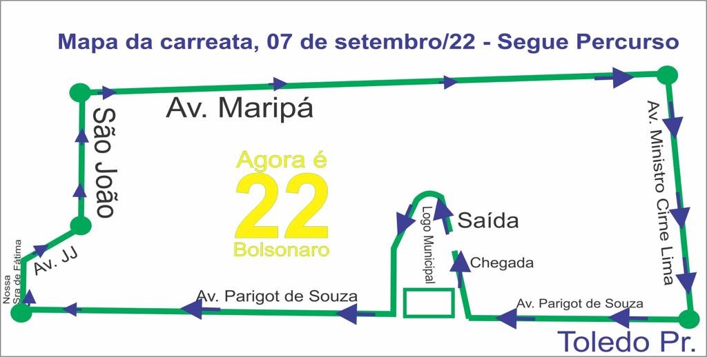 Creio que o 7 de setembro em Toledo esteja nublado em sua atmosfera e quente para o lado da política. Caso o tempo venha colaborar, o nosso Parque Ecológico Diva Paim Barth estará movimentadíssimo com o desfile cívico, cujo início está programado para às 8h. Já a partir das 14h, o clima das comemorações do Bicentenário da Independência começa a esquentar com a movimentação dos grupos políticos pró-Bolsonaro, com uma grande carreata, como está no layout: