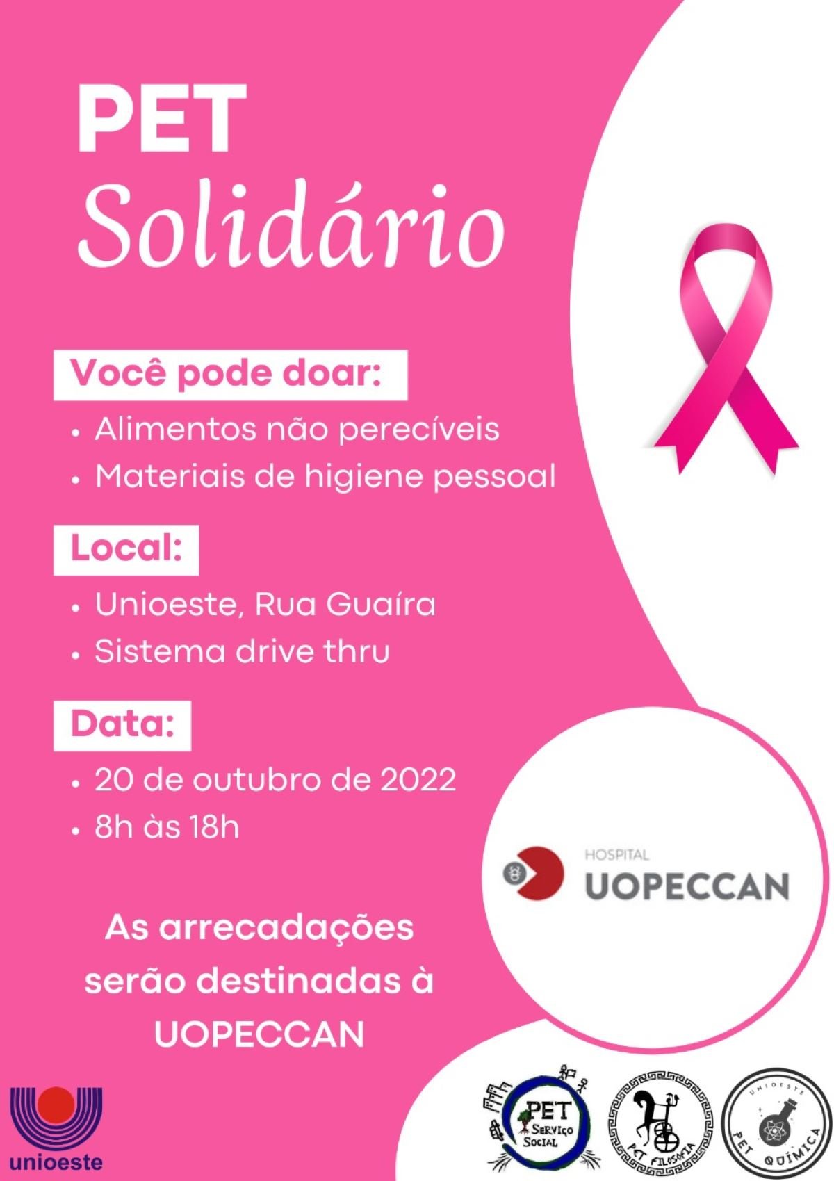 Os Programas de Ensino Tutorado (PET) de Filosofia, Química e Serviço Social do campus de Toledo da Universidade Estadual do Oeste do Paraná (Unioeste) promovem, no próximo dia 20, o PET Solidário. Os PETs arrecadam doações de alimentos não perecíveis e materiais de limpeza e higiene para o Hospital do Câncer de Cascavel (Uopeccan) em alusão ao Outubro Rosa, campanha de prevenção ao Câncer de Mama.