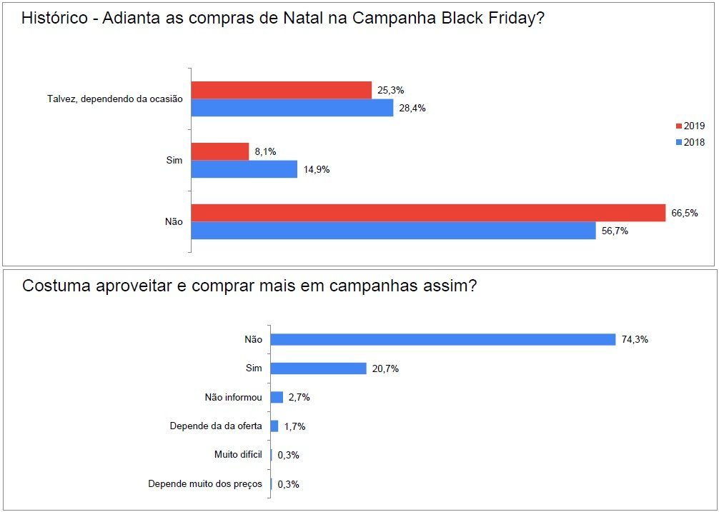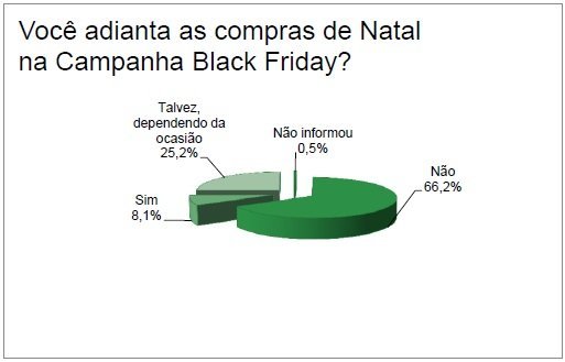A sondagem também questionou se os consumidores adiantam as compras de Natal durante a campanha. A maioria (66,2%) disse que não; 25,2% disseram que talvez, dependendo da ocasião e se a promoção realmente valer a pena; 8,1% afirmaram que adiantam as compras de fim de ano e 0,5% não informou. A parcela de paranaenses que antecipa as compras de Natal para a sexta-feira de promoções também reduziu na comparação com o ano passado. Na época, 14,9% responderam que antecipariam suas compras.
