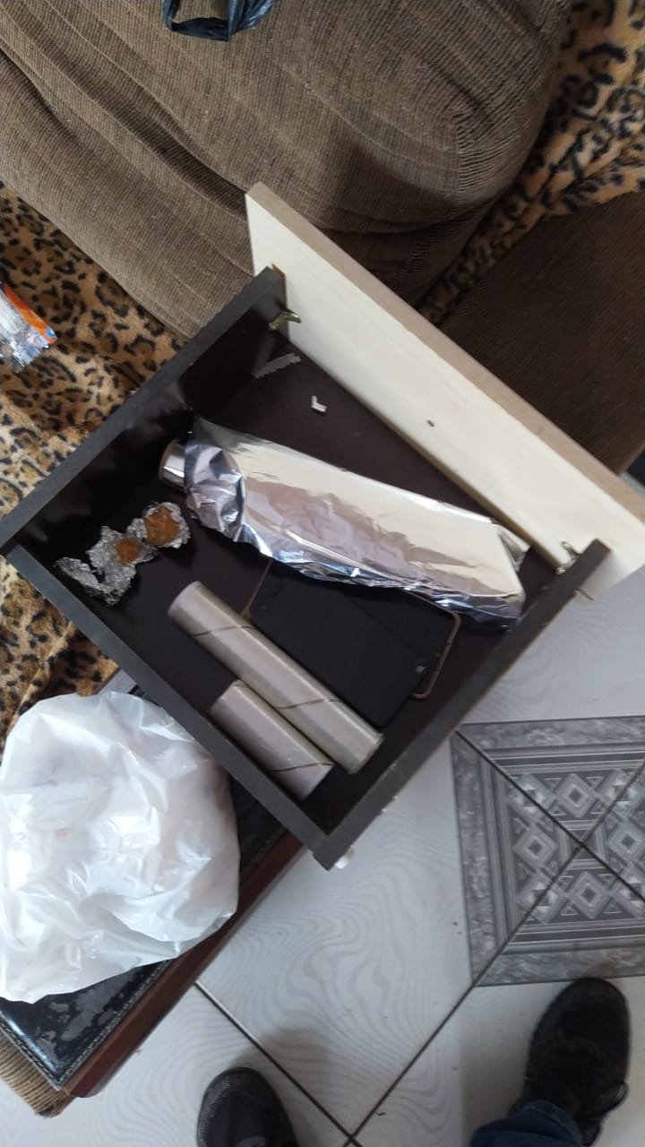 Ao todo, foram encontrados e apreendidos 43 pinos de cocaína (57 gramas), 50 pedras de crack (23 gramas), 55 gramas de maconha e 62 gramas de haxixe. Também foram encontrados materiais típicos do tráfico, utilizados para embalar e armazenar drogas, como rolos de papel alumínio e insulfilm, além de uma balança de precisão para a pesagem e caderno com anotações da contabilidade.