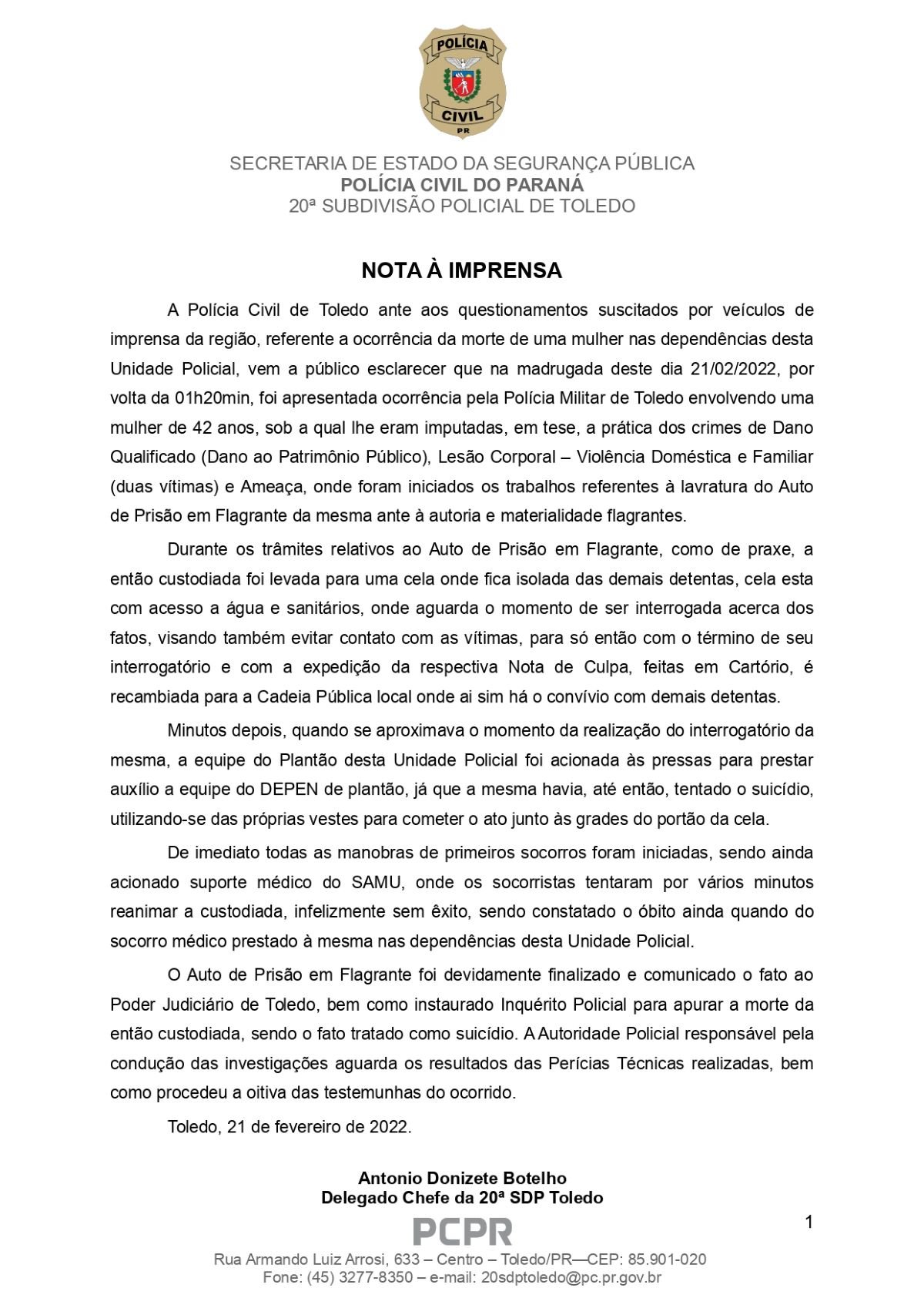 Depois da grande repercussão gerada pela notícia da morte ocorrida na delegacia de Toledo, quando, após ser presa, uma mulher se matou dentro de uma cela, a Polícia Civil se manifestou através de uma nota assinada pelo delegado-chefe da 20ª SDP, Dr. Antonio Donizete Botelho, e encaminhada no início da noite de ontem (21).
