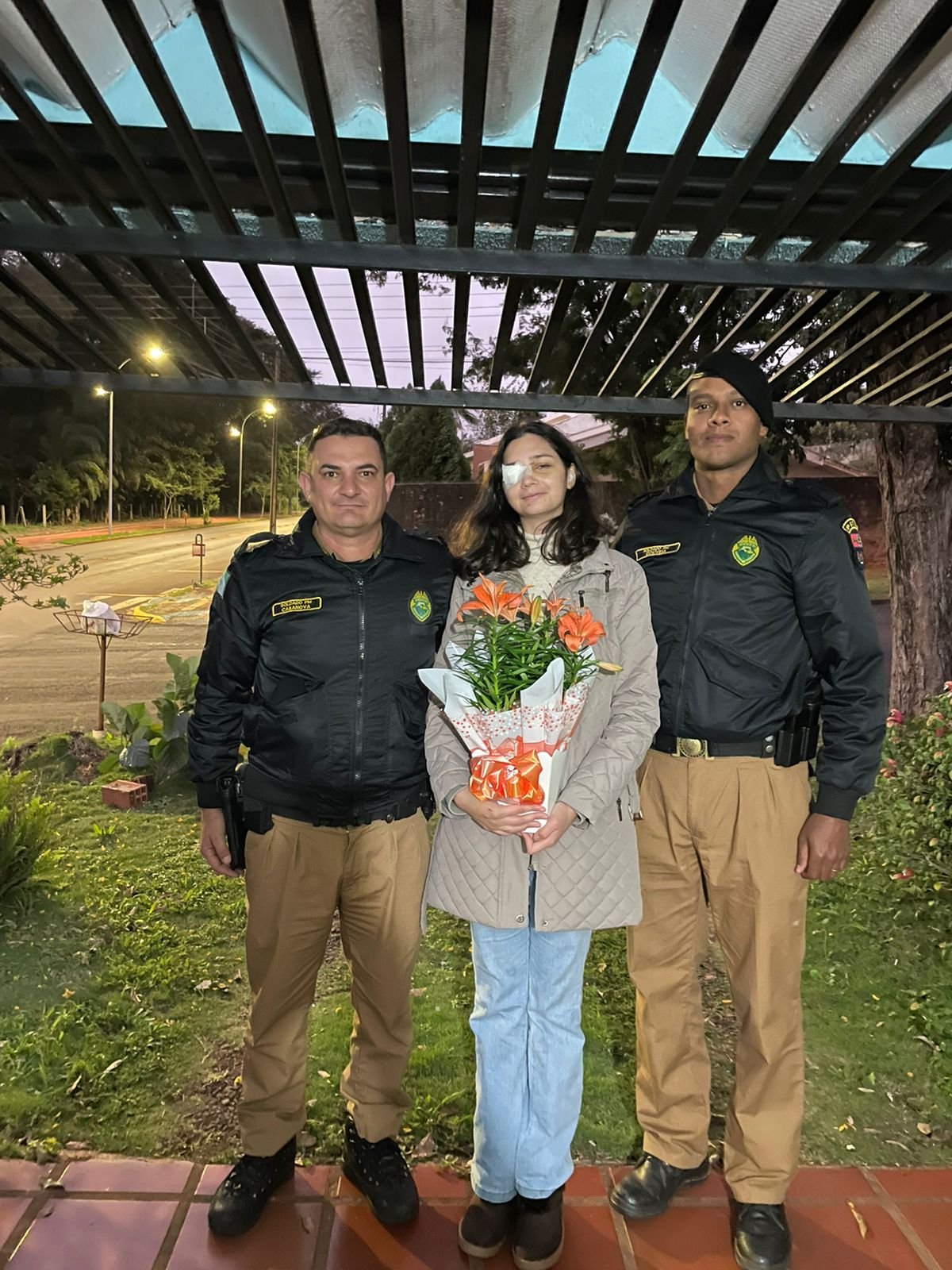 Ontem (18), eles estiveram com toda a equipe policial na residência de Marisangela e lhe presentearam com um buquê de flores, desejando-lhe também melhoras em seu estado de saúde, que ainda requer cuidados. Depois de receber várias facadas, que acertaram, entre outras partes, a cabeça, um olho, uma orelha e o tórax, a jovem precisou ser internada no HUOP (Hospital Universitário do Oeste do Paraná). Nessa semana ela recebeu alta e se recupera em casa, devendo ainda passar por novos exames para avaliar seu olho.