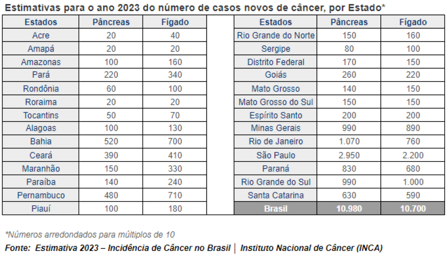 O Instituto Nacional de Câncer (INCA) estima mais de 700 mil novos casos de câncer no país no próximo ano, sendo o Sul e o Sudeste onde se encontram 70% da incidência dos casos. No Paraná, o INCA estima que serão diagnosticados cerca de 830 novos casos de câncer de pâncreas e 680 de fígado, uma taxa de 7,08 e 5,79 casos para cada 100 mil habitantes, respectivamente, apenas em 2023. Este foi o primeiro ano em que a instituição incluiu estes tipos de cânceres na estimativa nacional por serem problema de saúde pública em regiões brasileiras e também com base nas estimativas mundiais.
